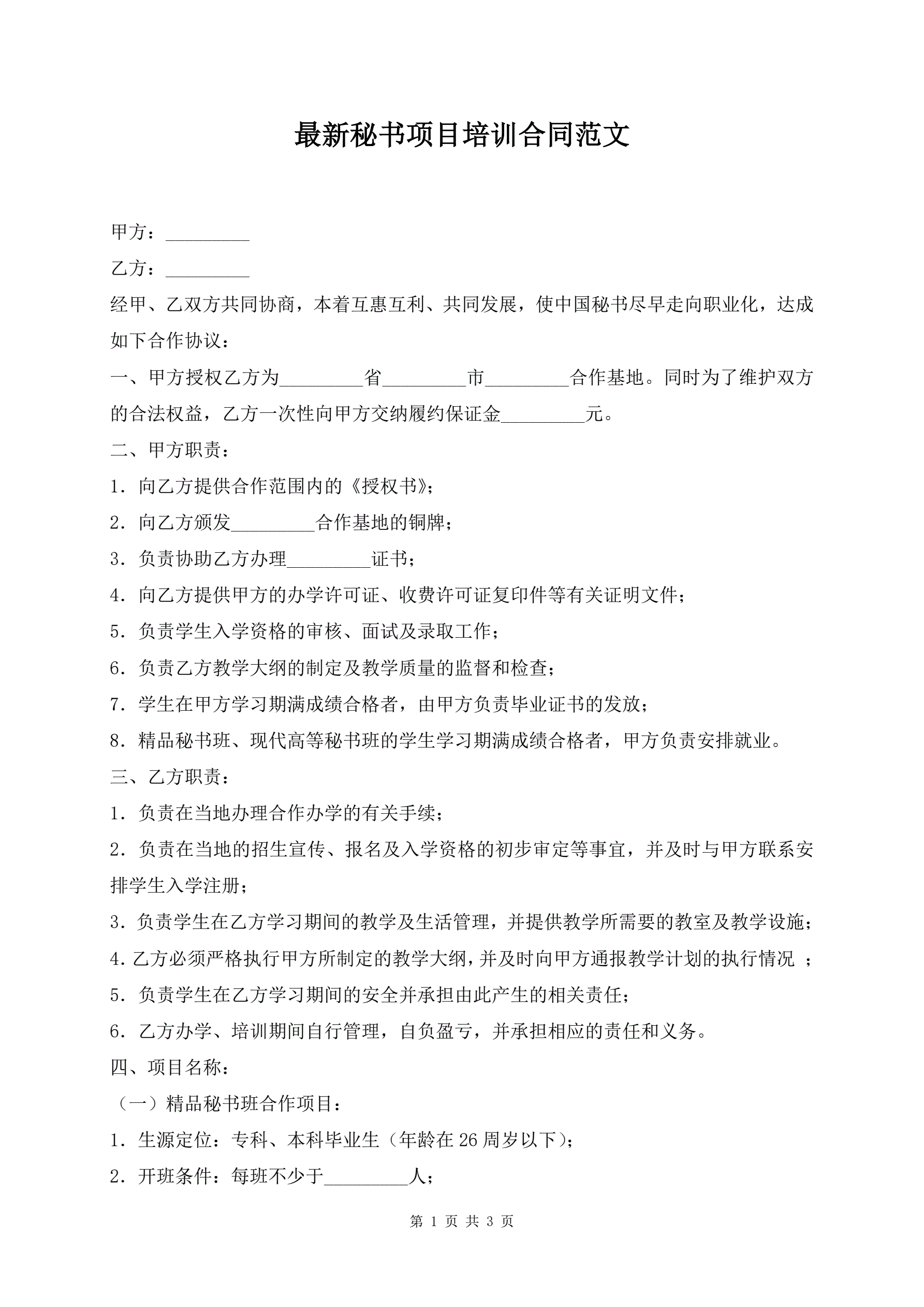 最新秘书项目培训合同范文