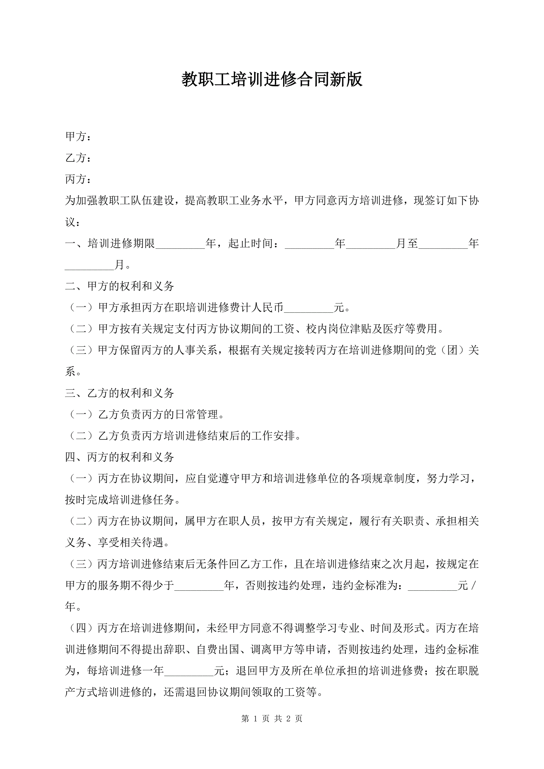 >教职工培训进修合同新版