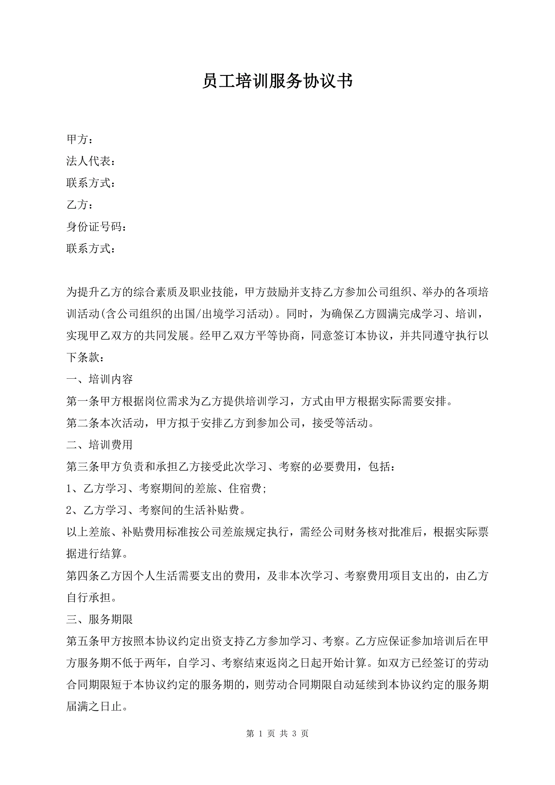 员工培训服务协议书