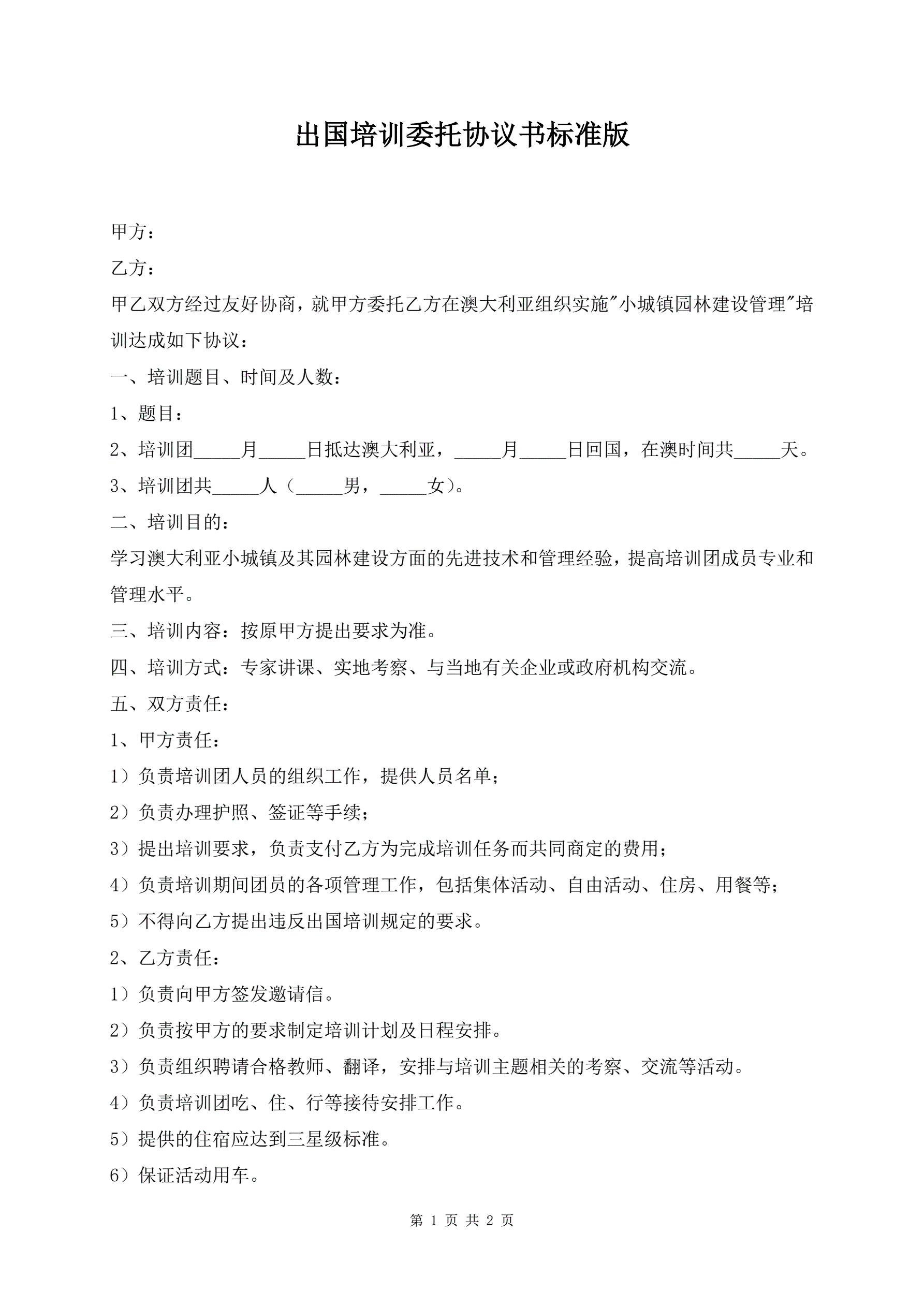 >出国培训委托协议书标准版