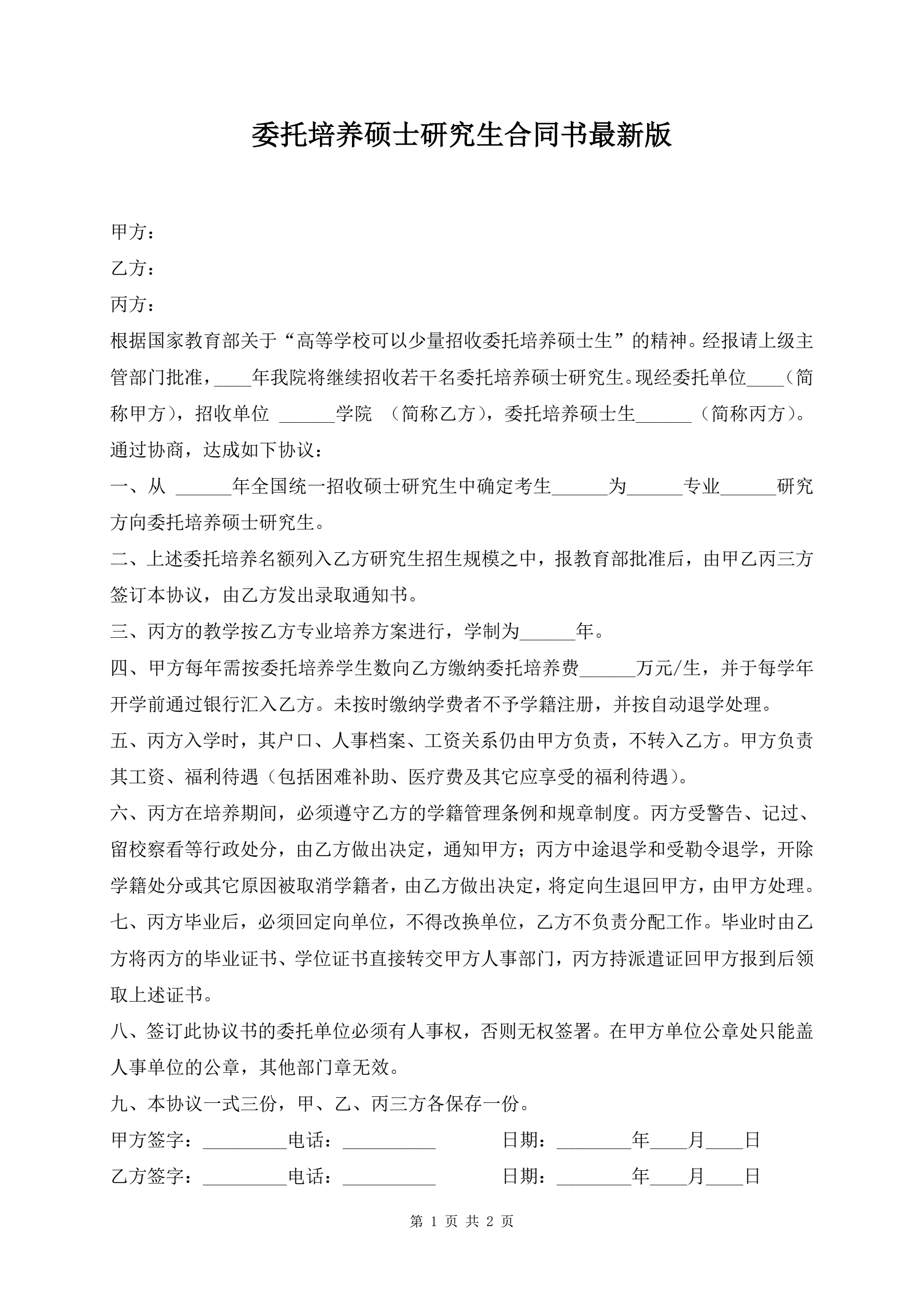 委托培养硕士研究生合同书最新版