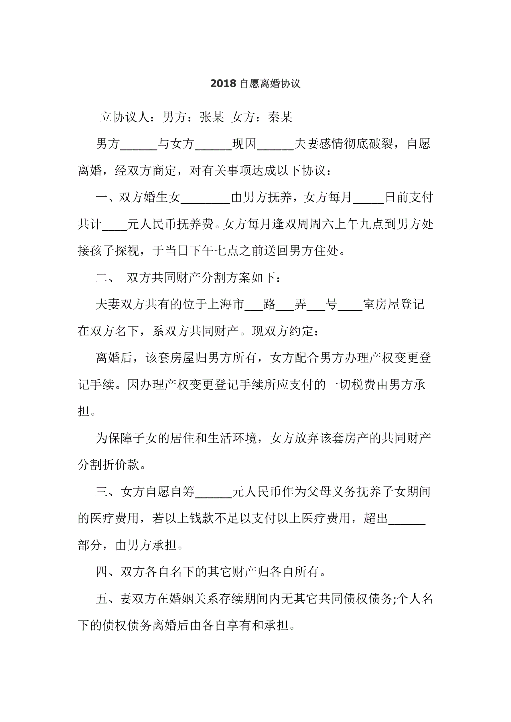 >2018自愿离婚协议书