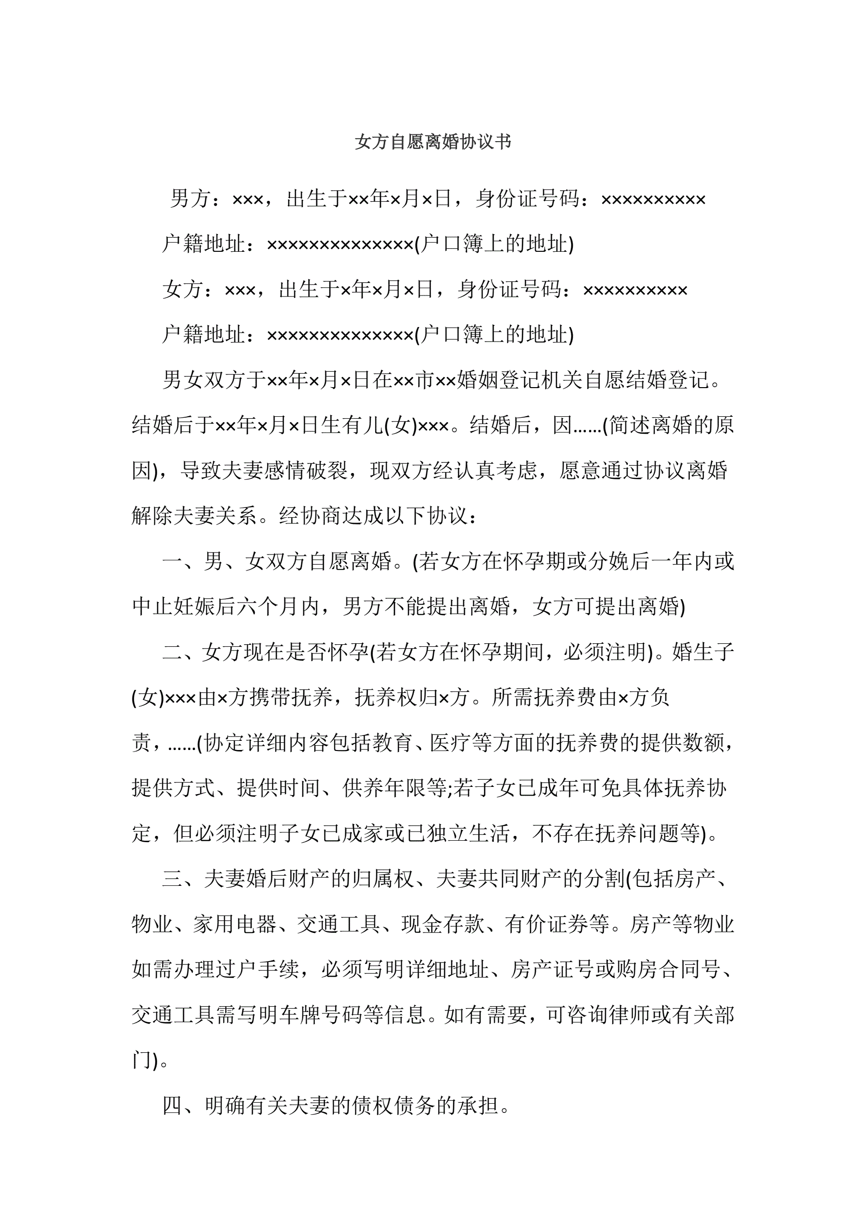 >女方自愿离婚协议书