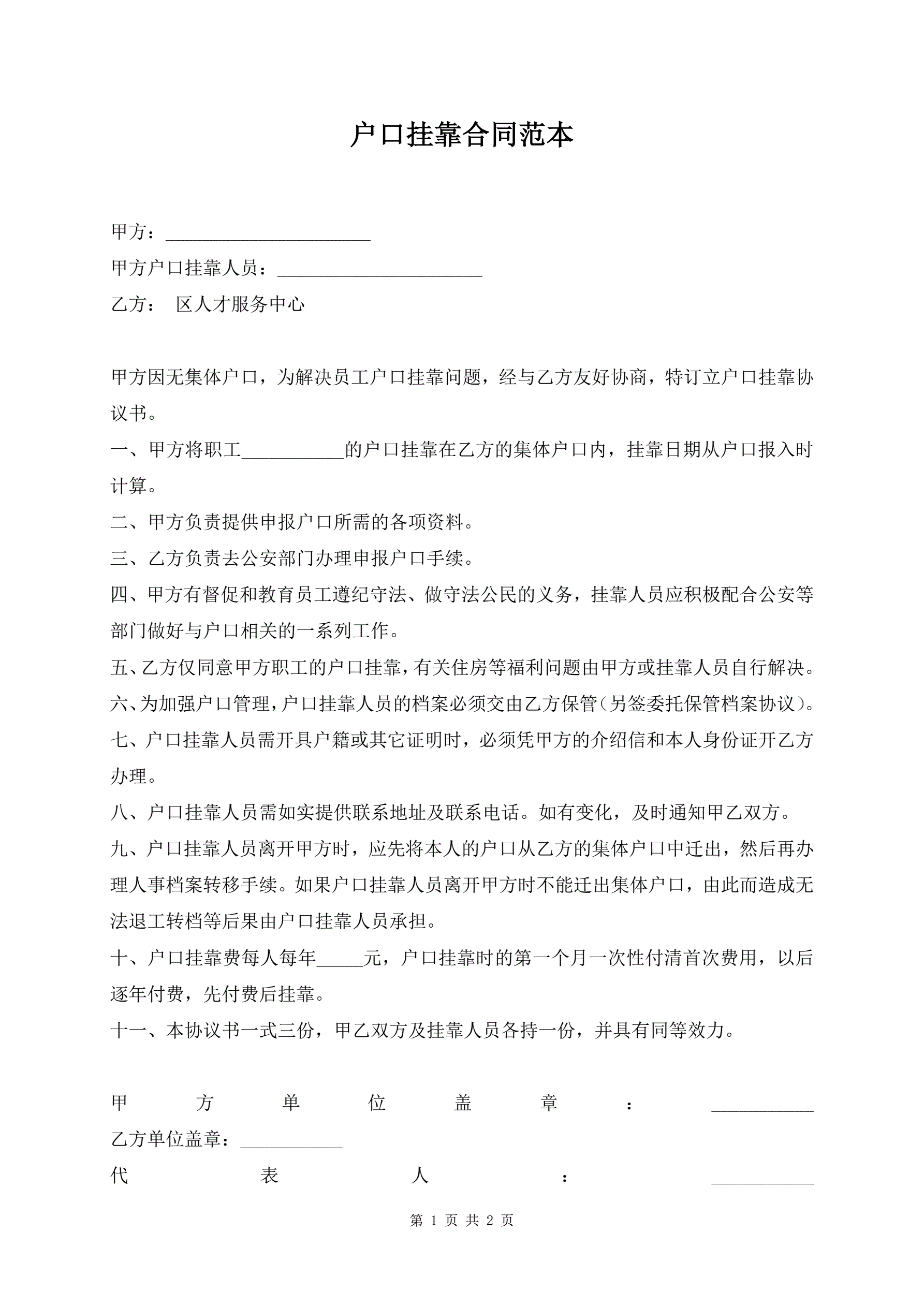 户口挂靠合同范本