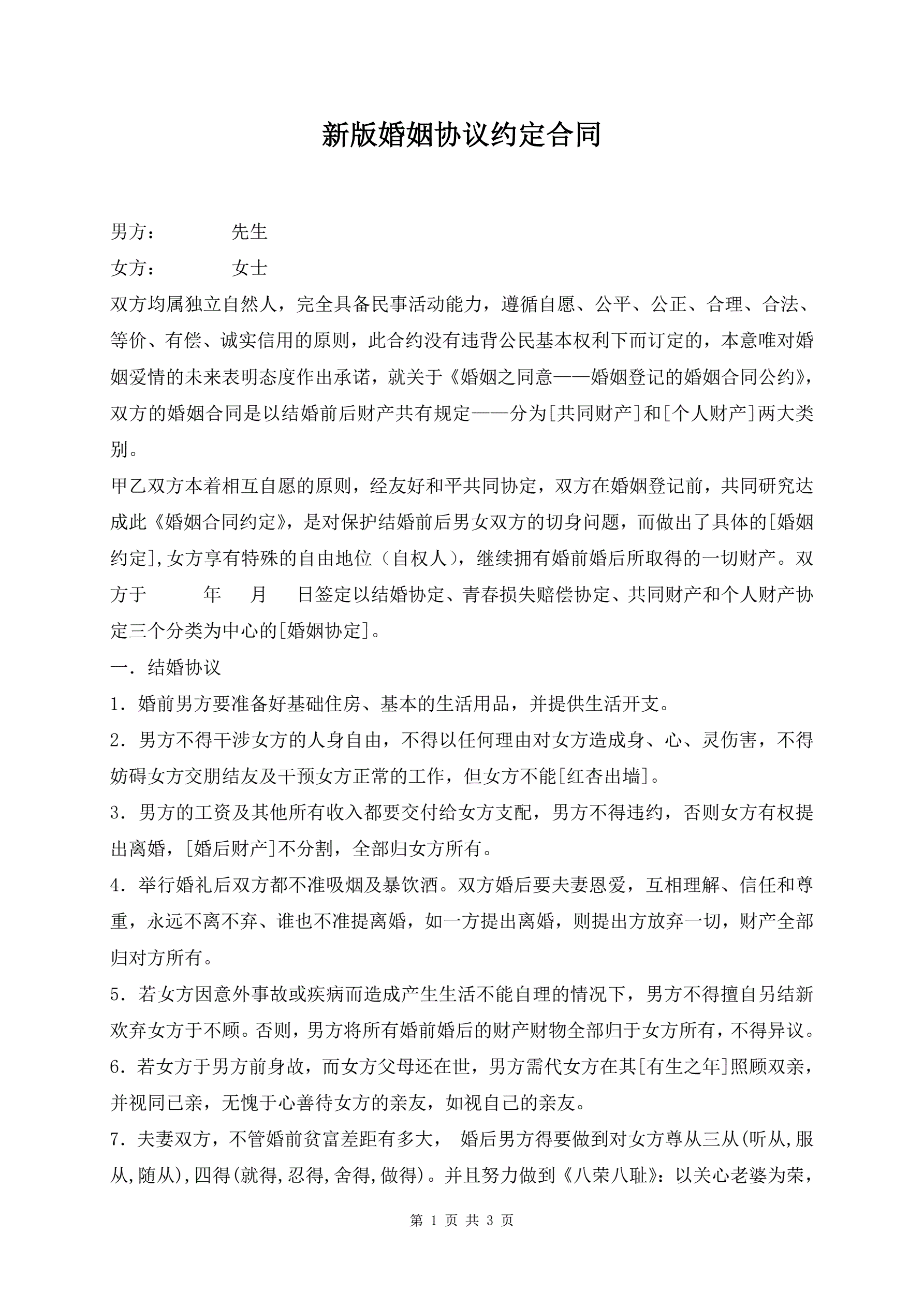 新版婚姻协议约定合同