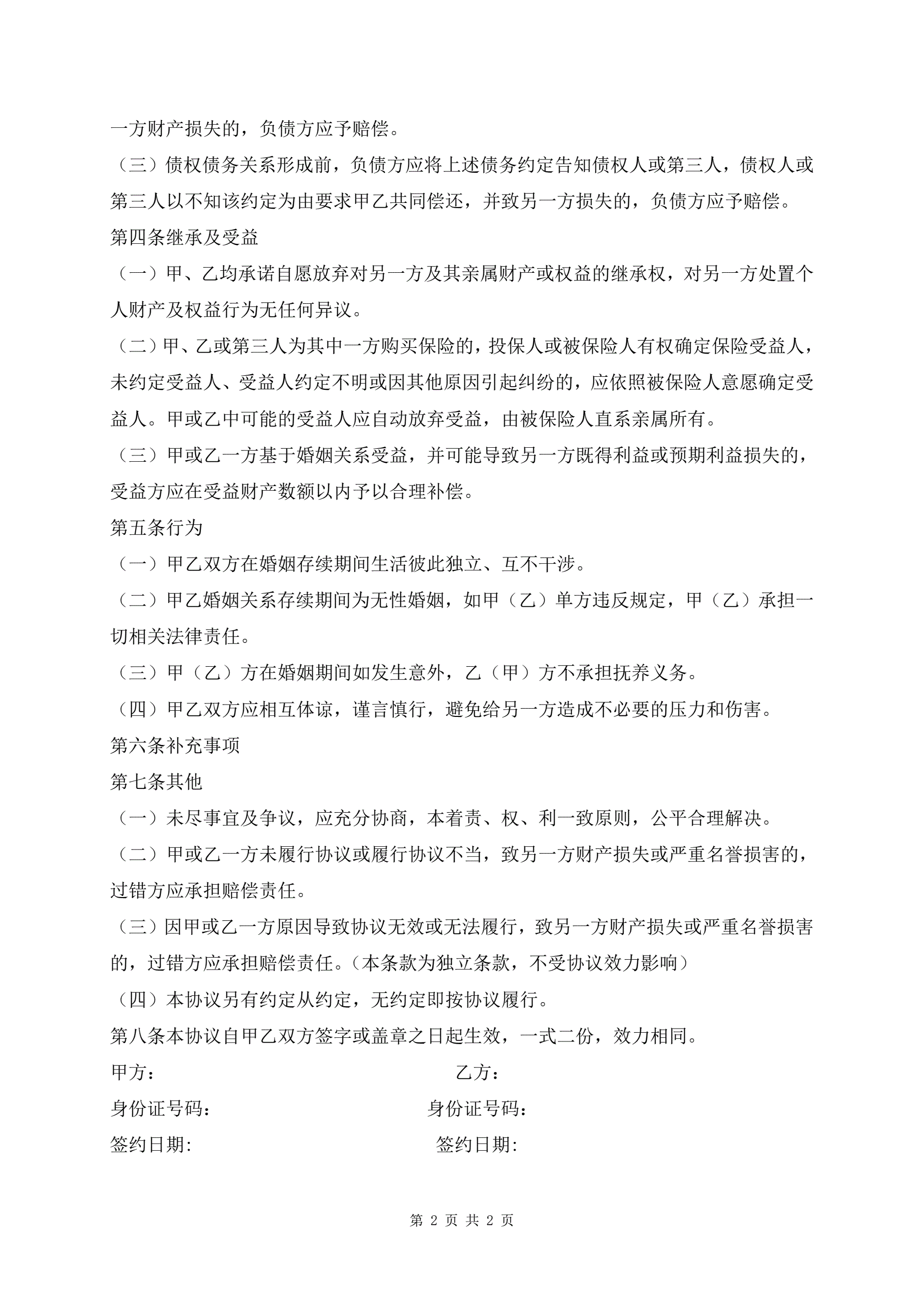 专业版婚姻财产协议样本