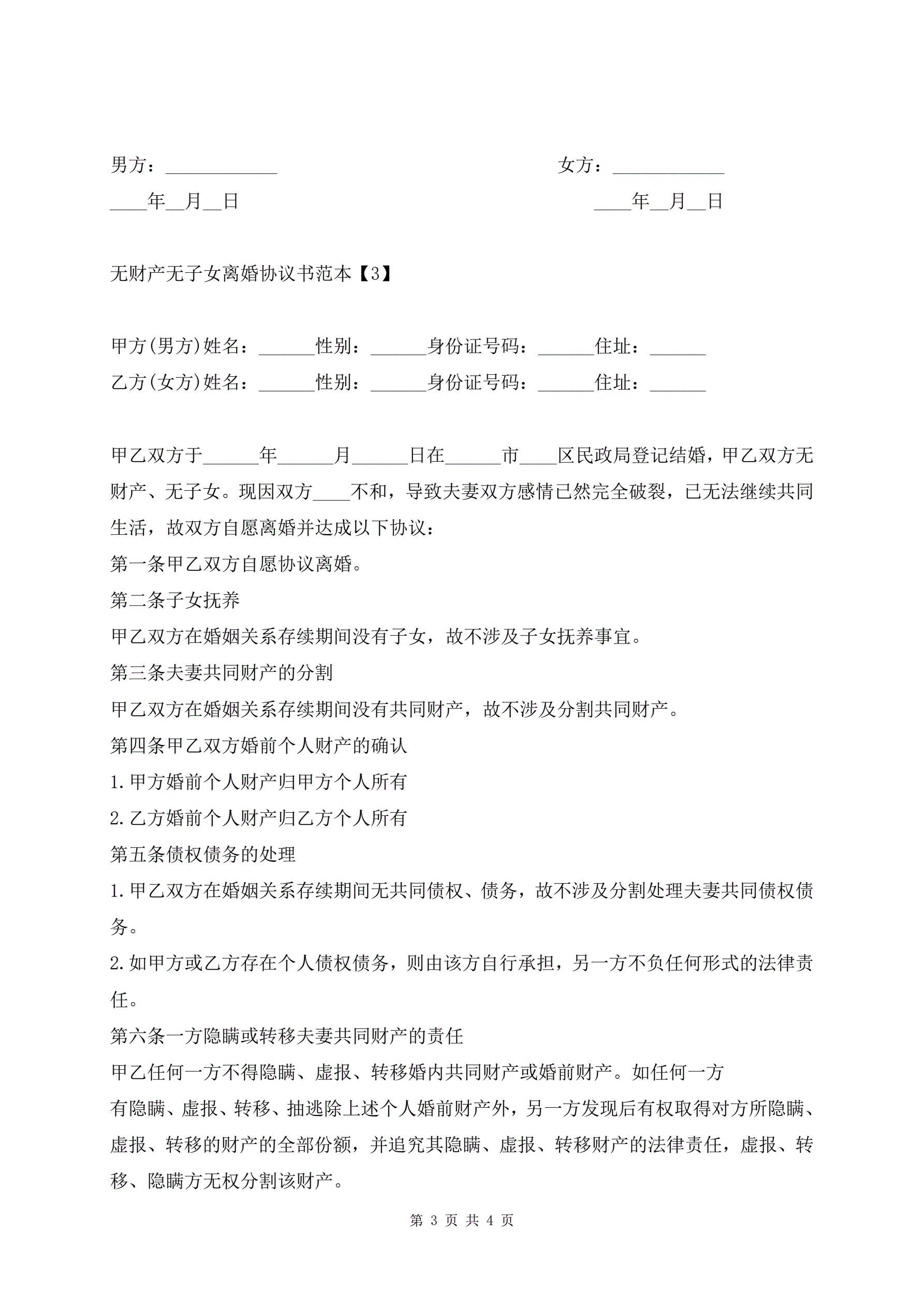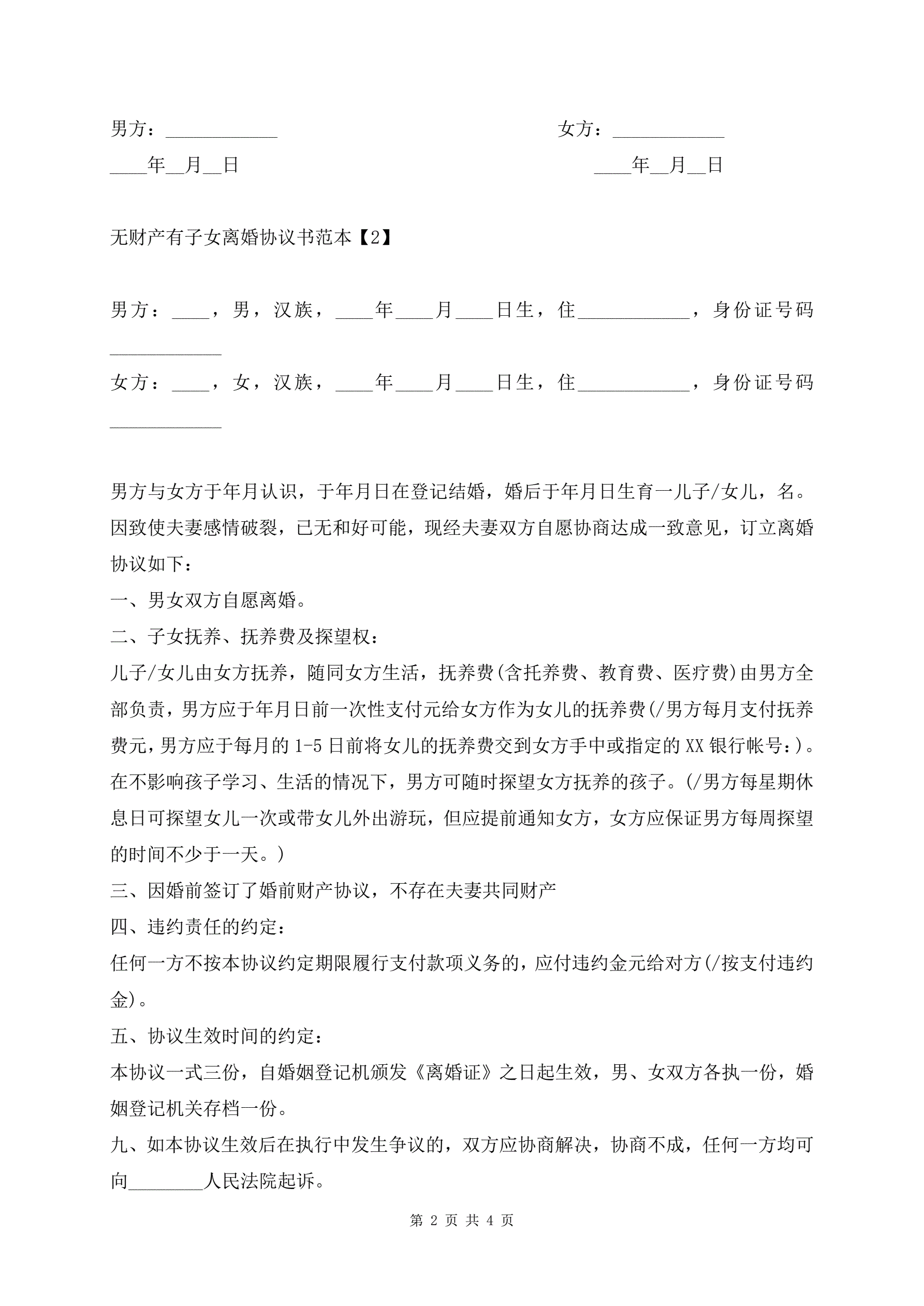 无财产有子女离婚协议书范本
