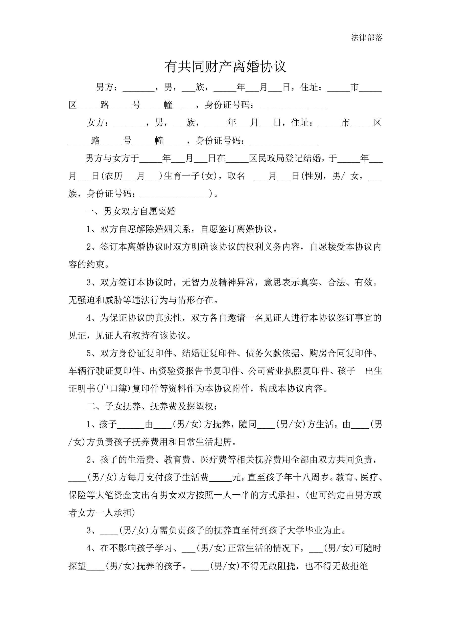 >离婚协议书(有子女有共同财产)