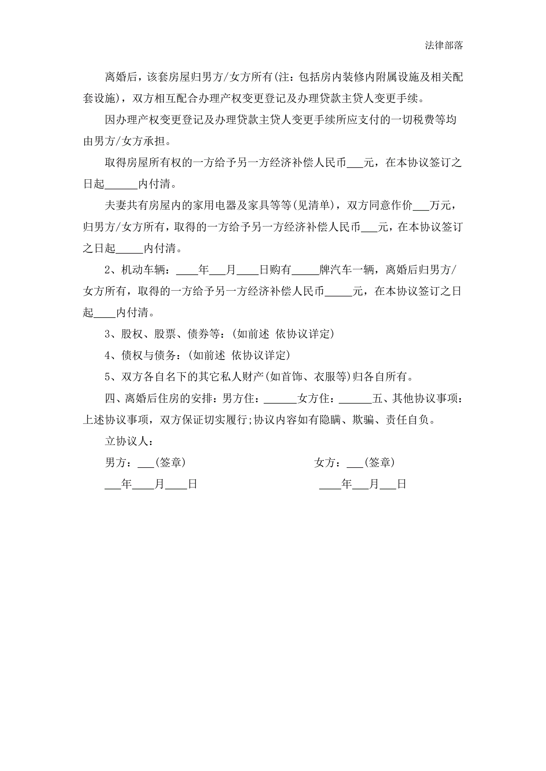 离婚协议模板简版