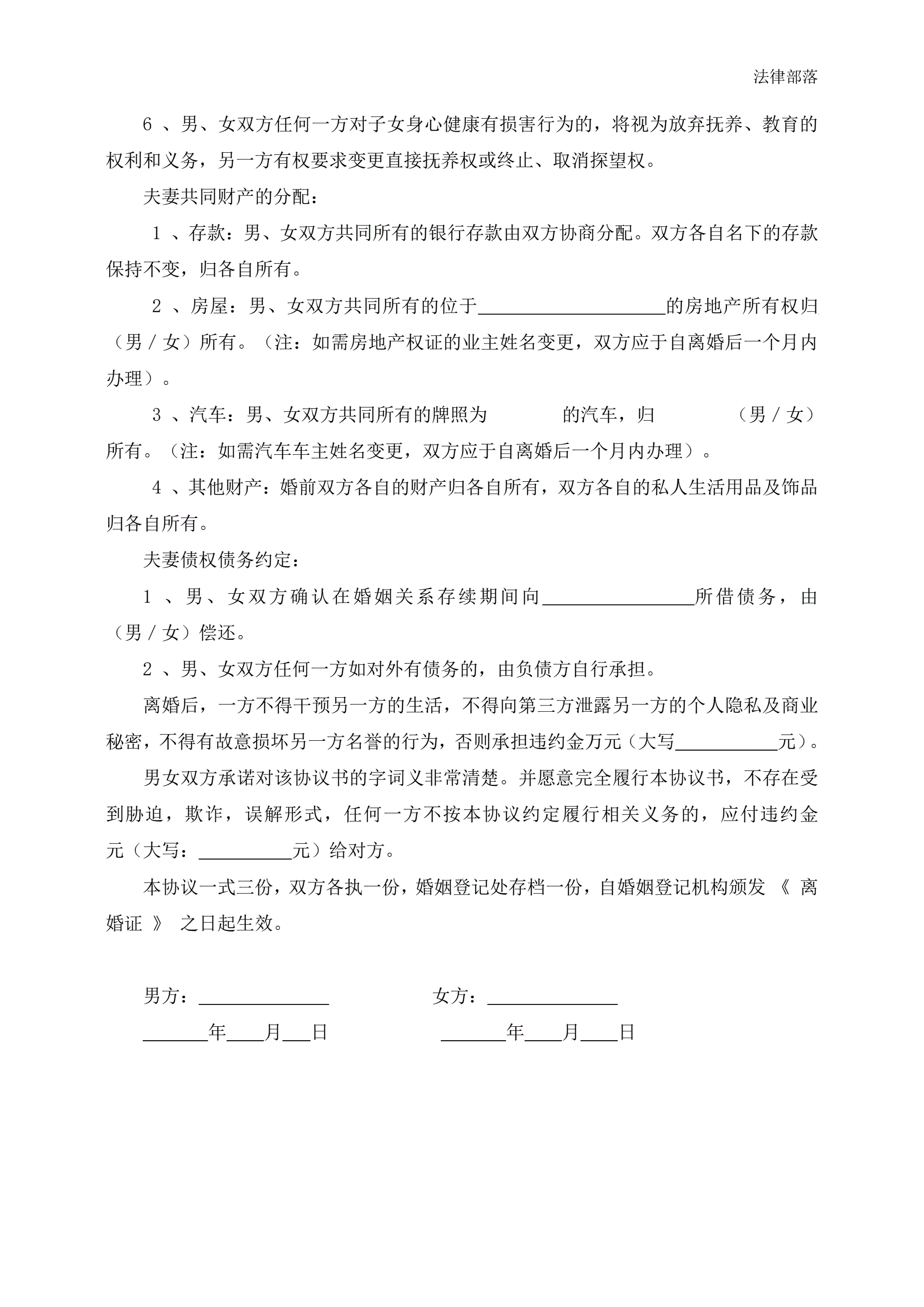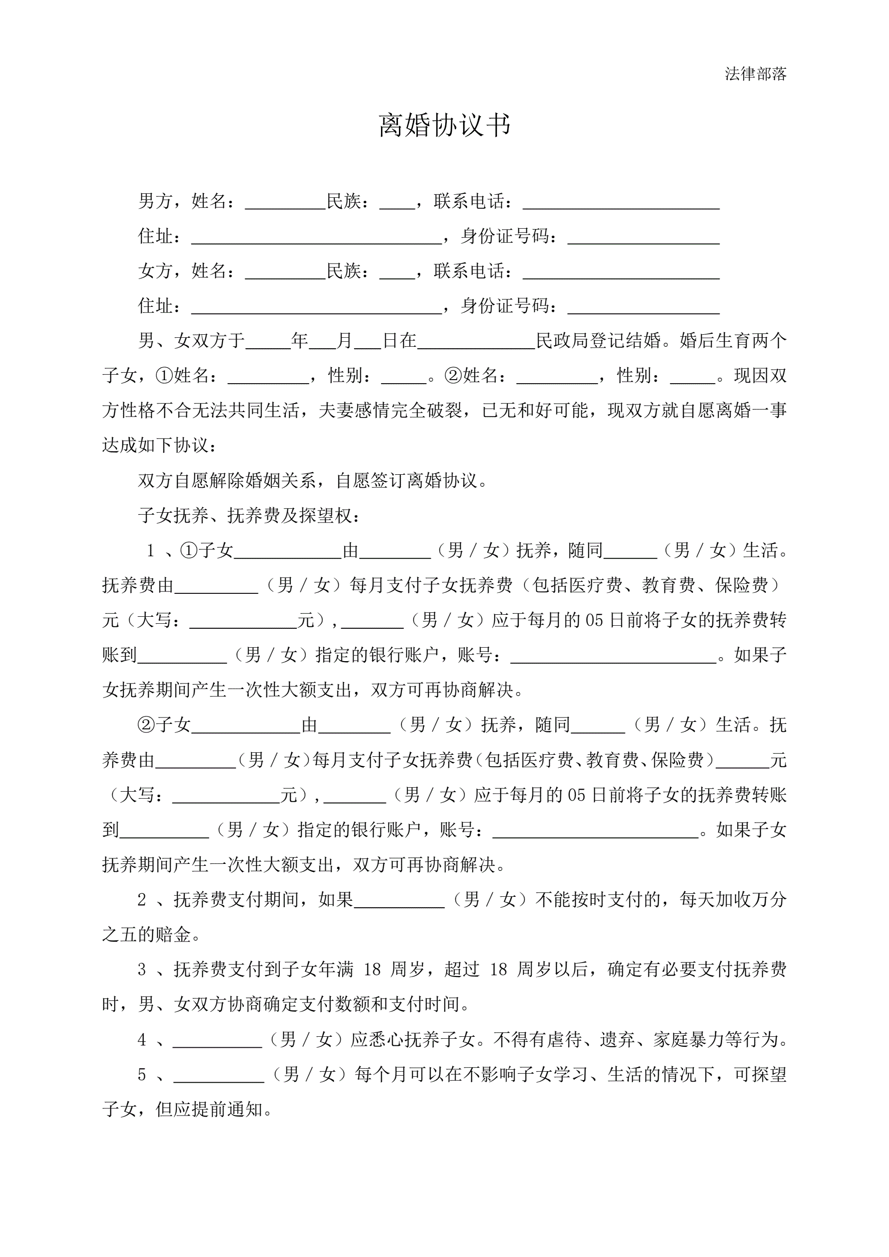 >离婚协议书(有财产有债务2个子女)