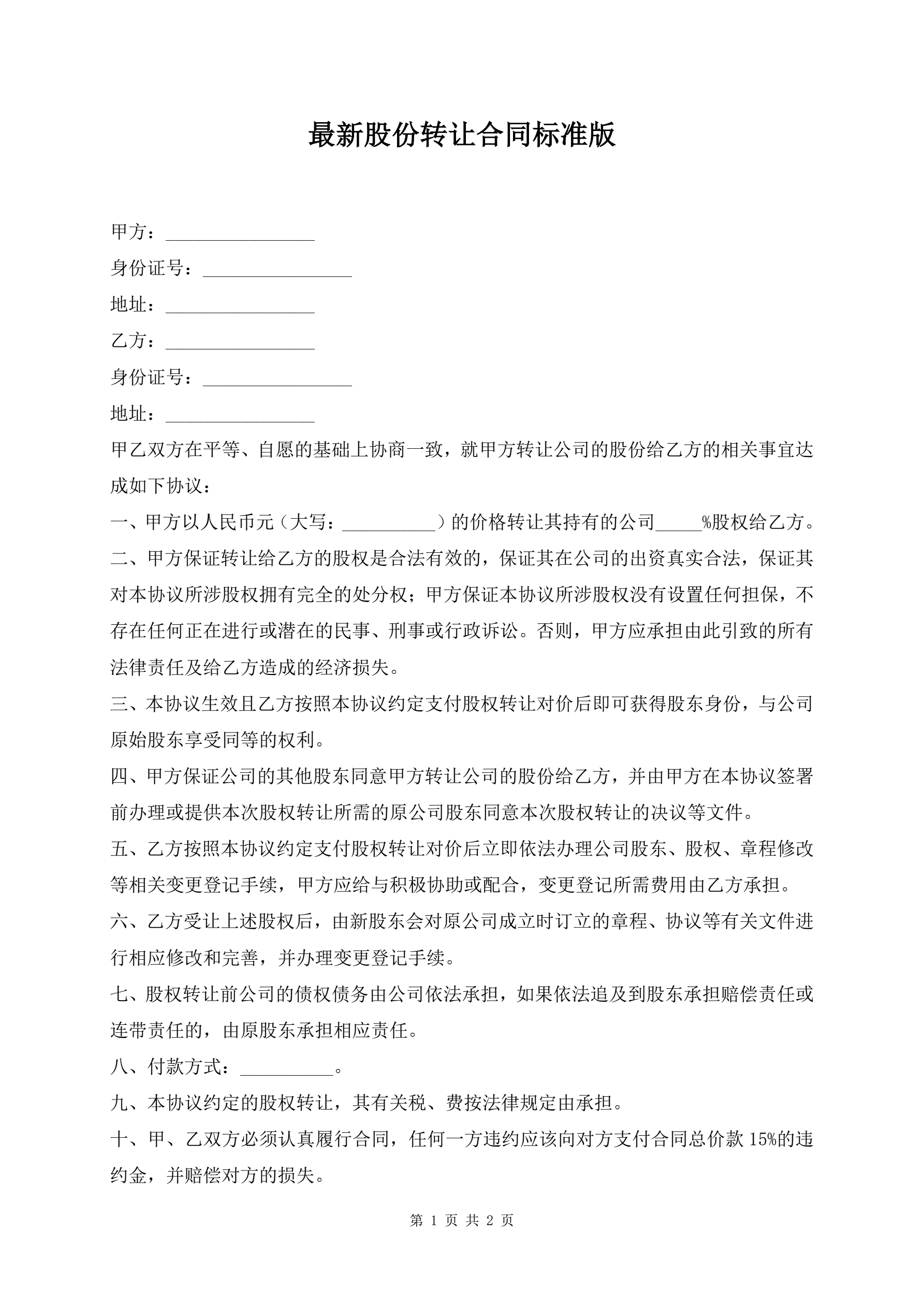 最新股份转让合同标准版
