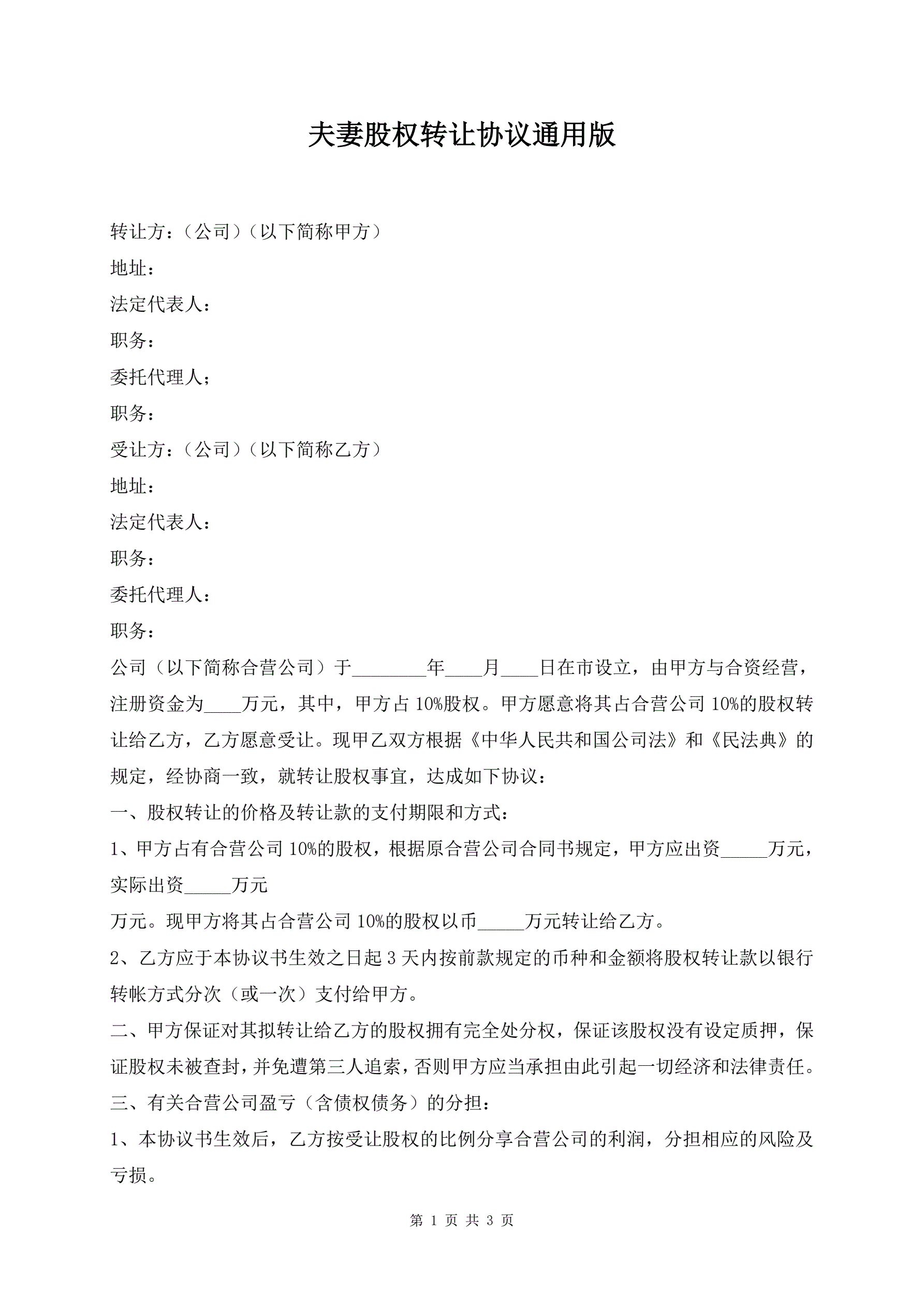 夫妻股权转让协议通用版