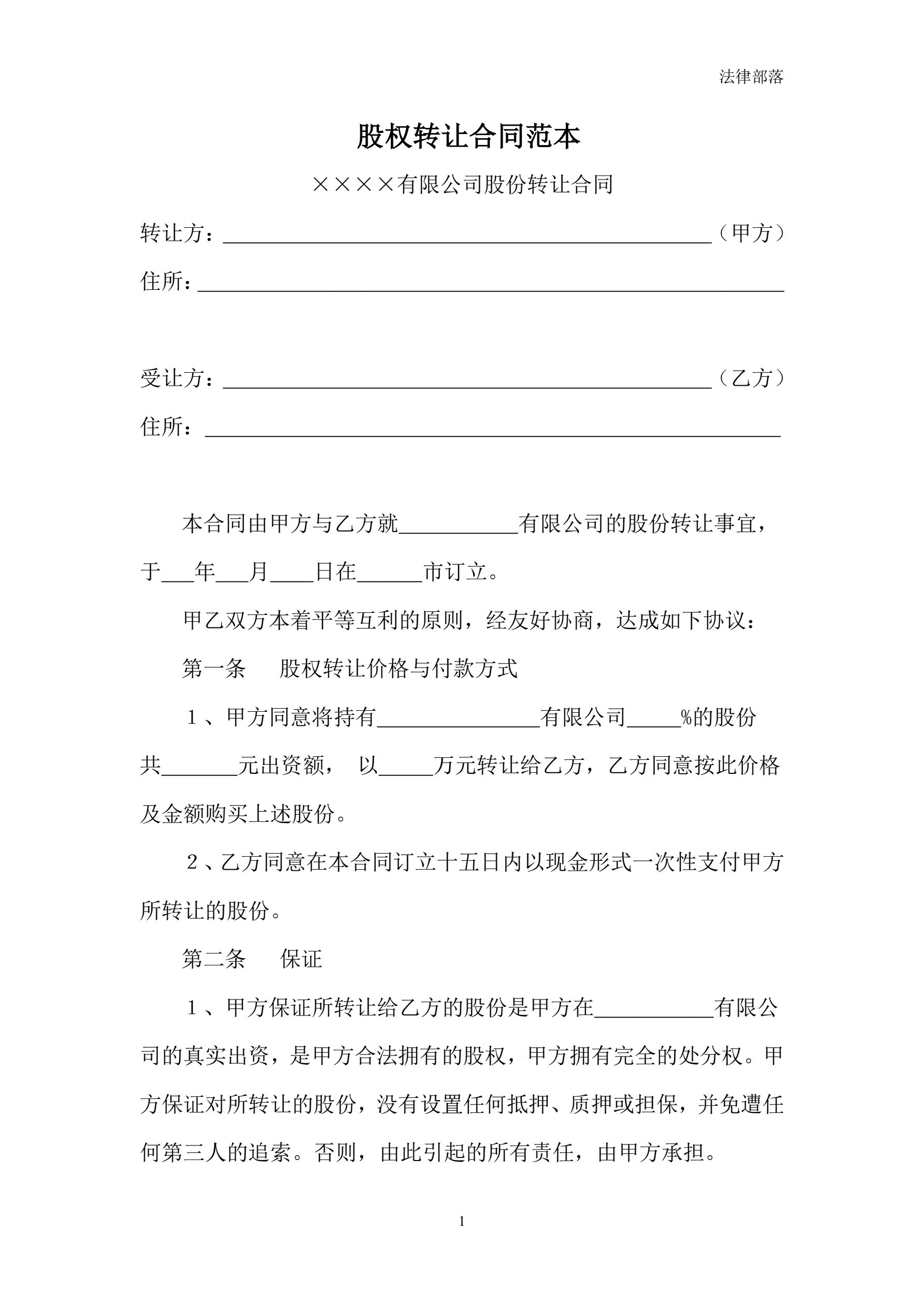 >股权转让合同范本(简单)