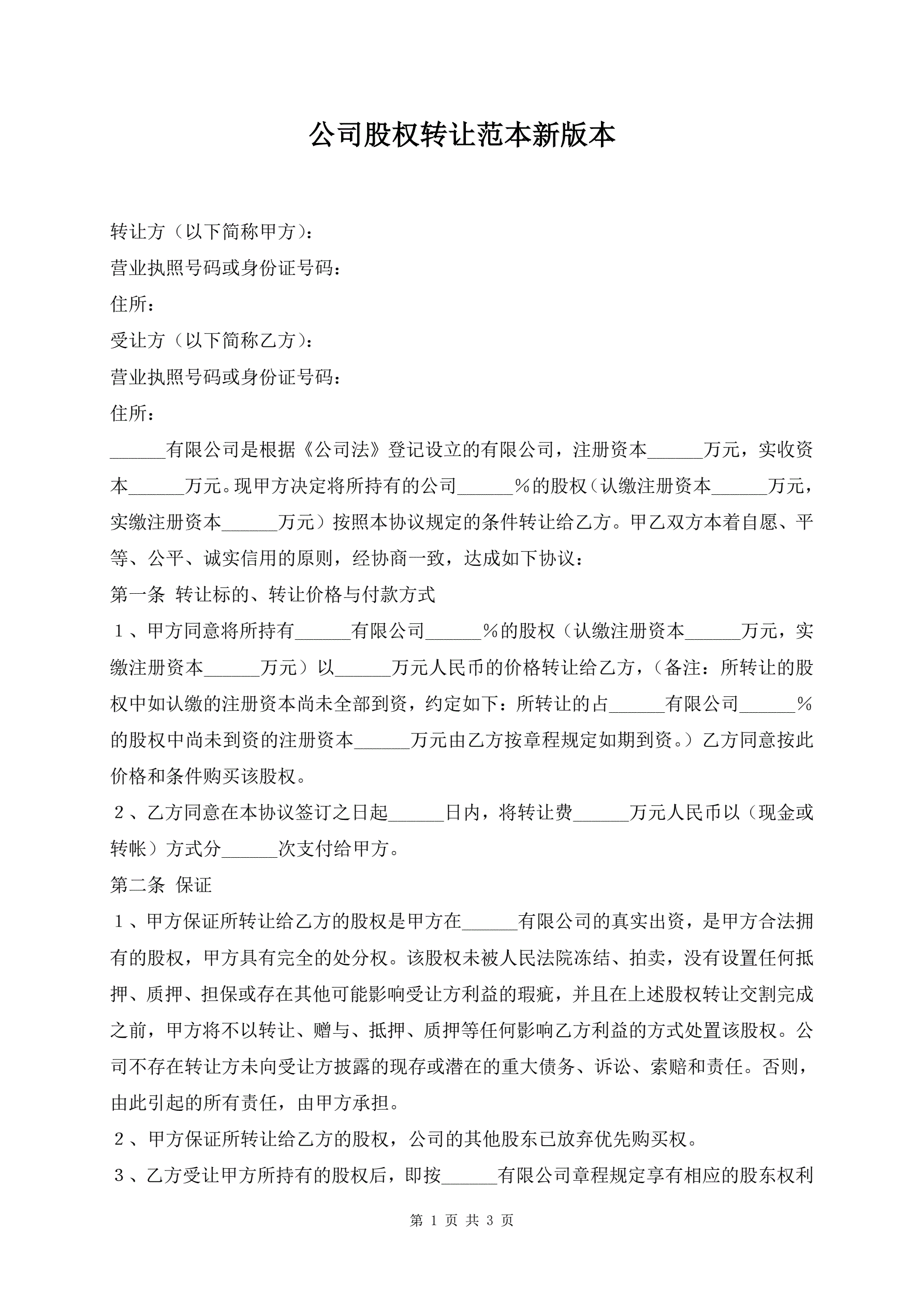 公司股权转让范本新版本