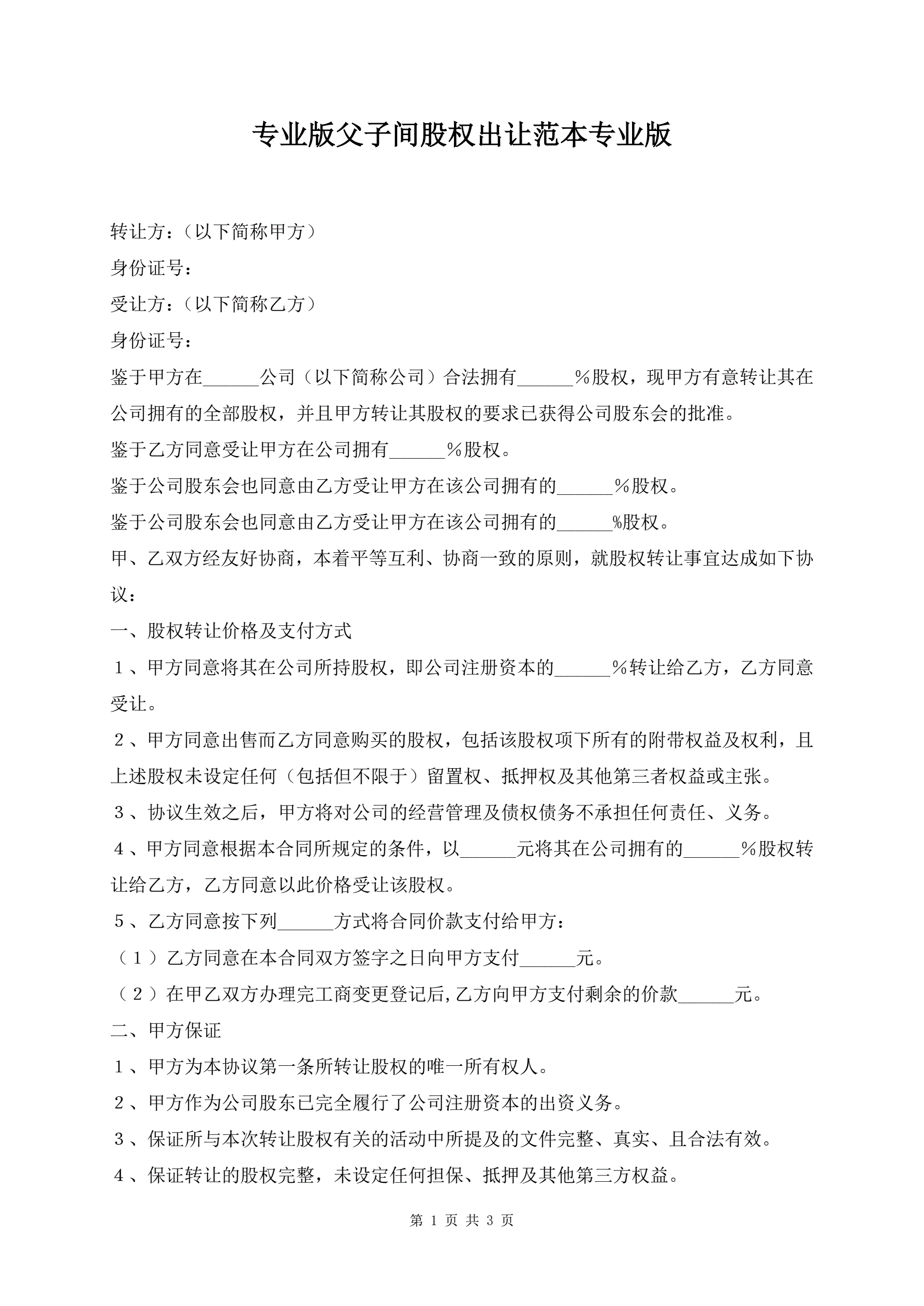 专业版父子间股权出让范本专业版