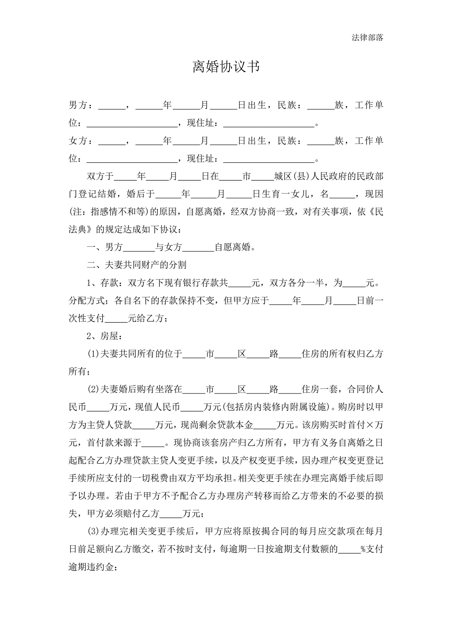 >离婚协议书范本二