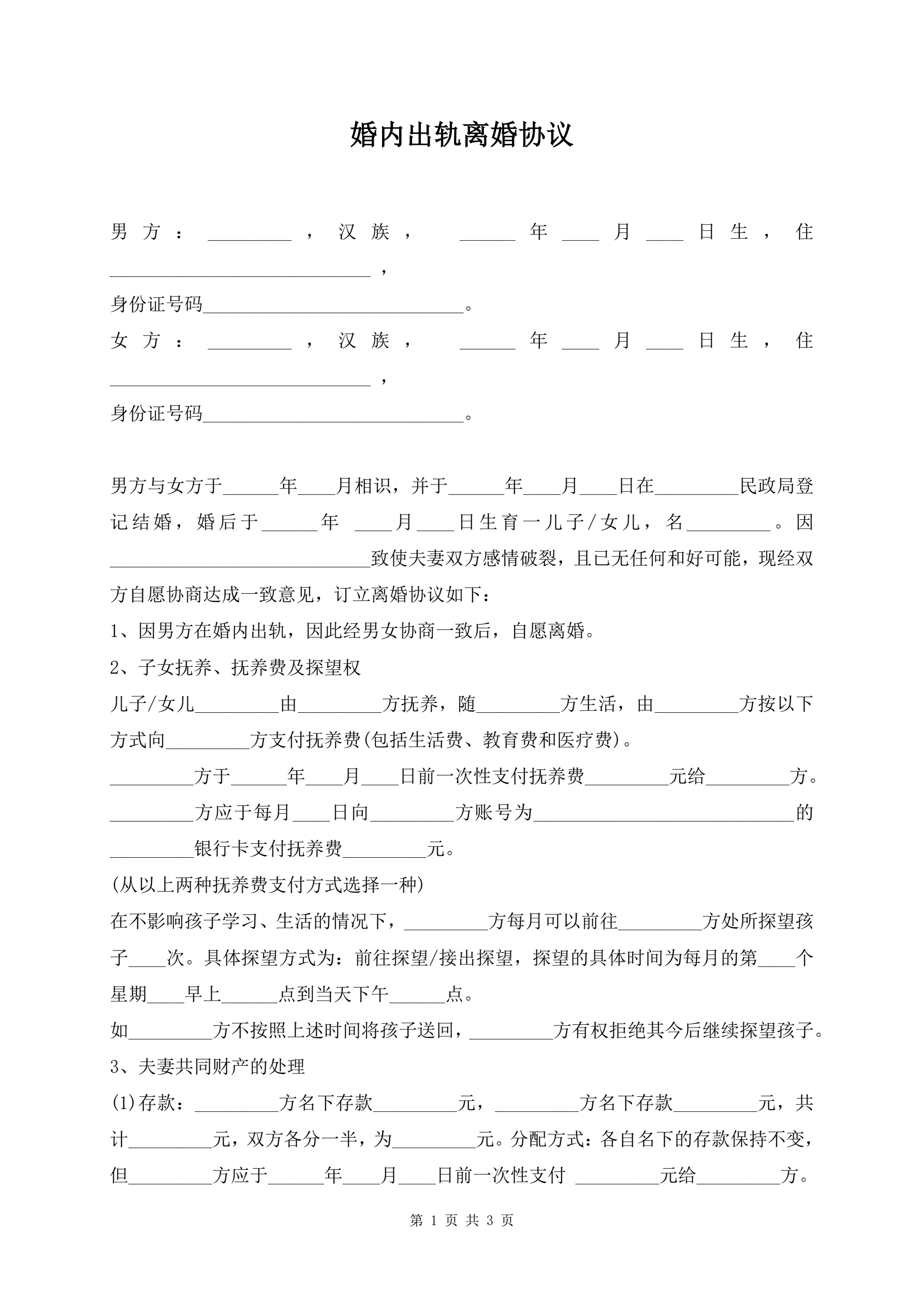 婚内出轨离婚协议