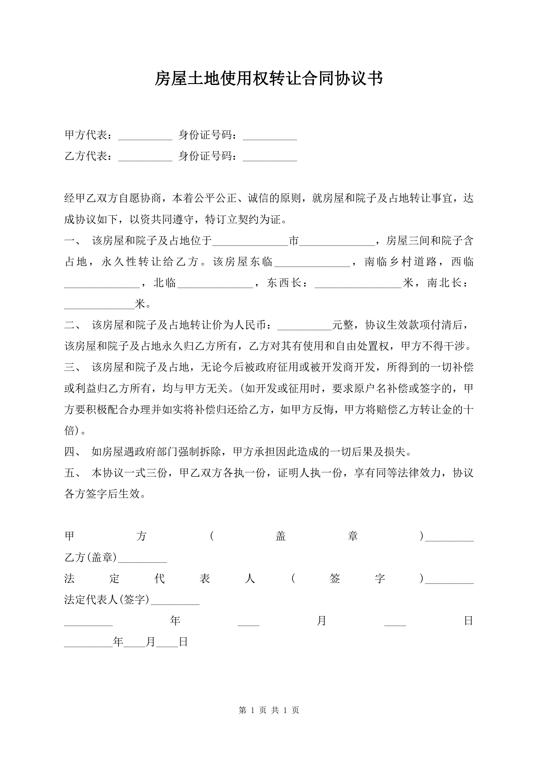 房屋土地使用权转让合同协议书