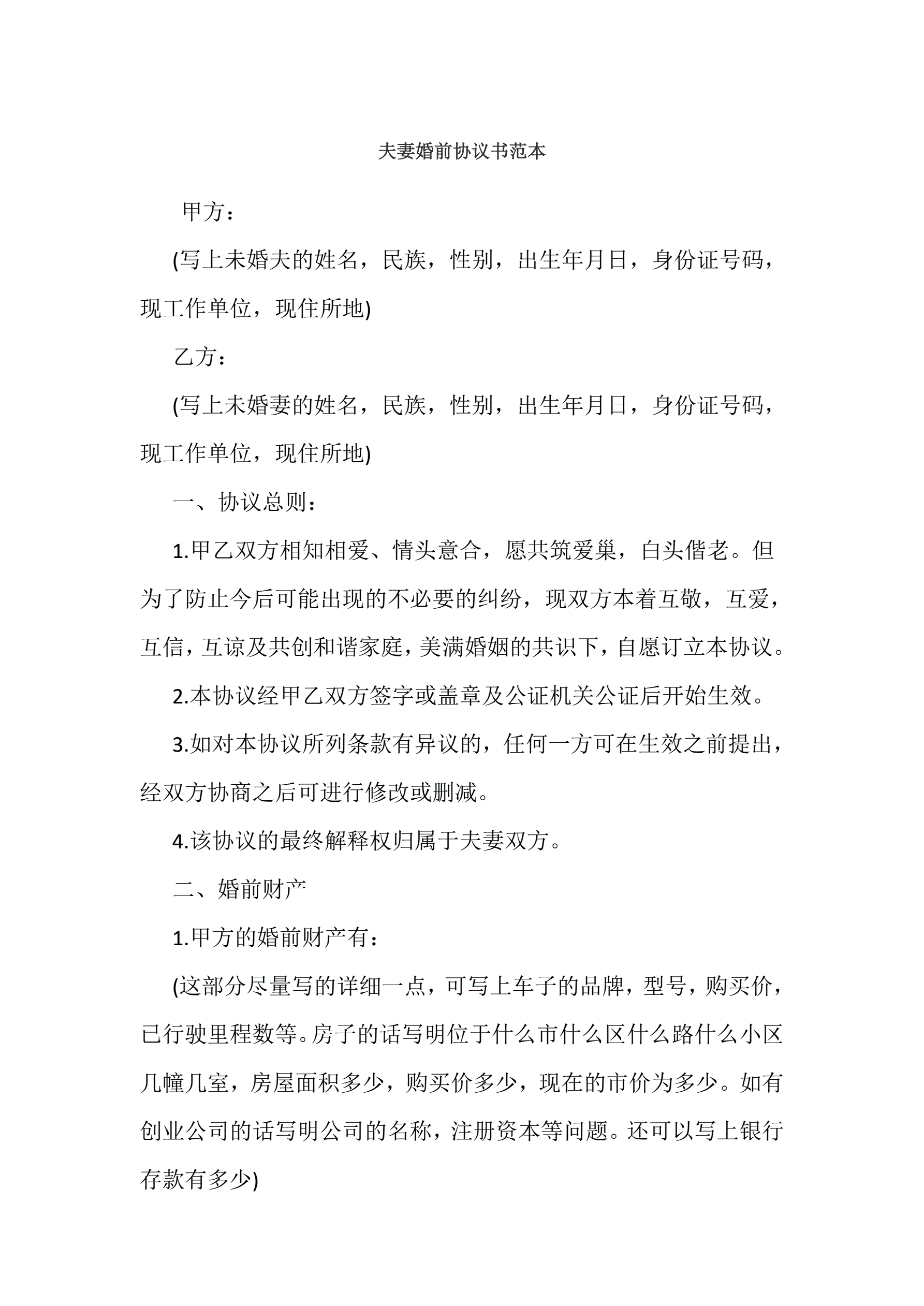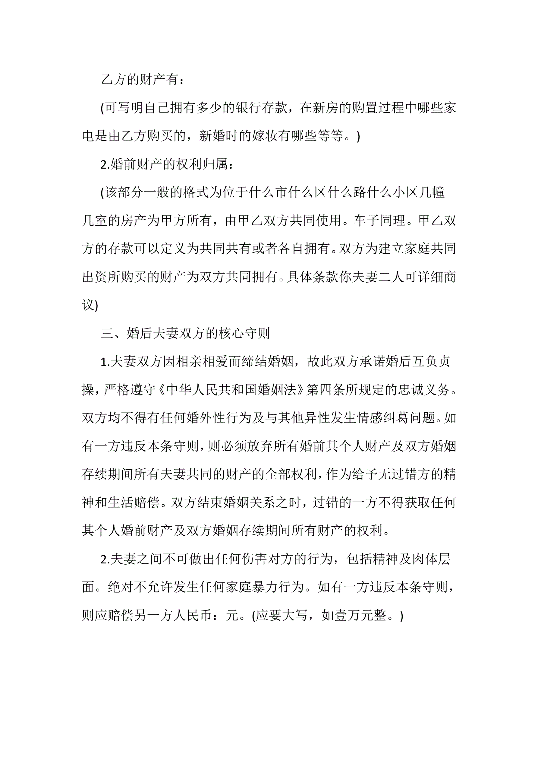 夫妻婚前协议书范本