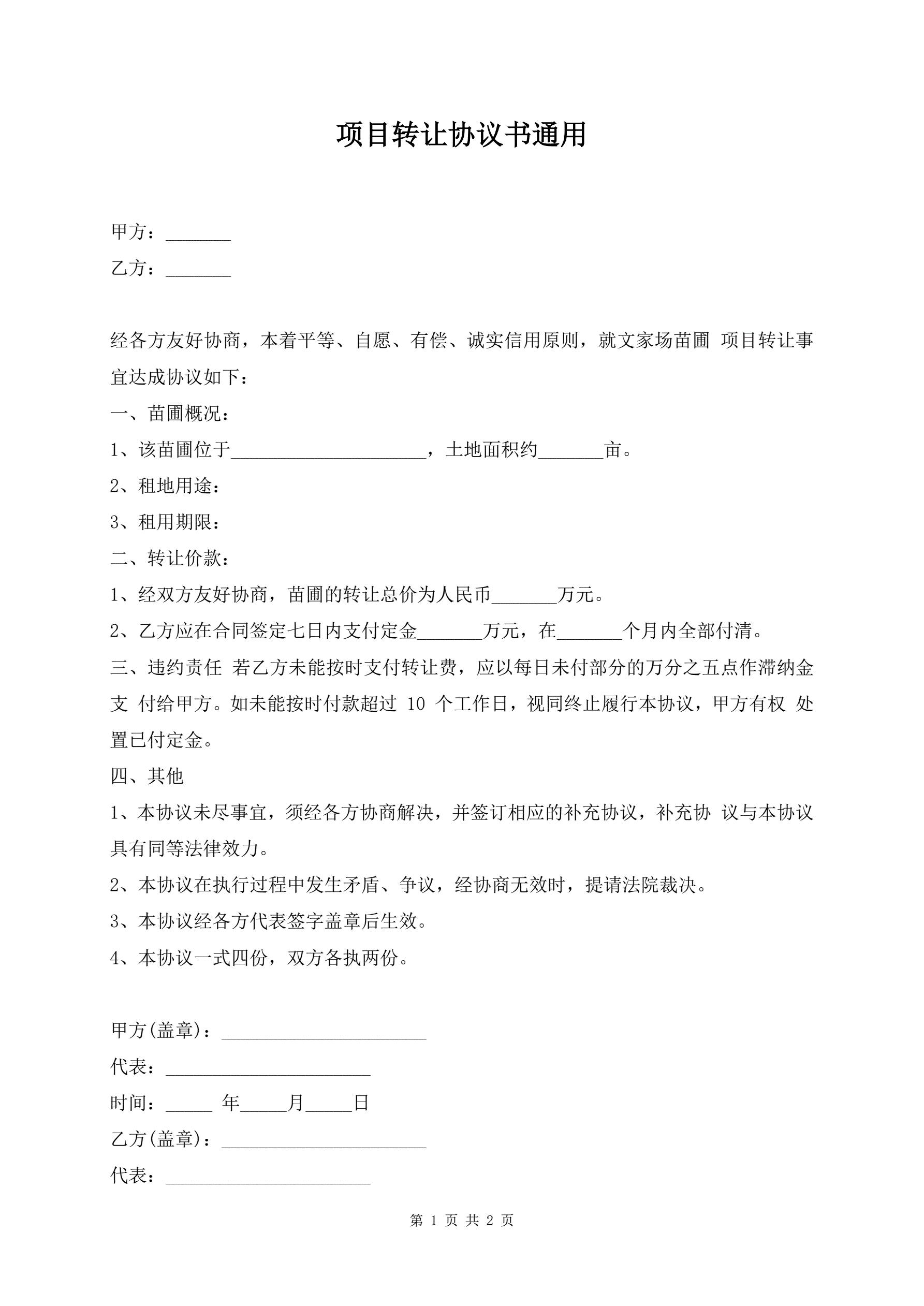 项目转让协议书通用