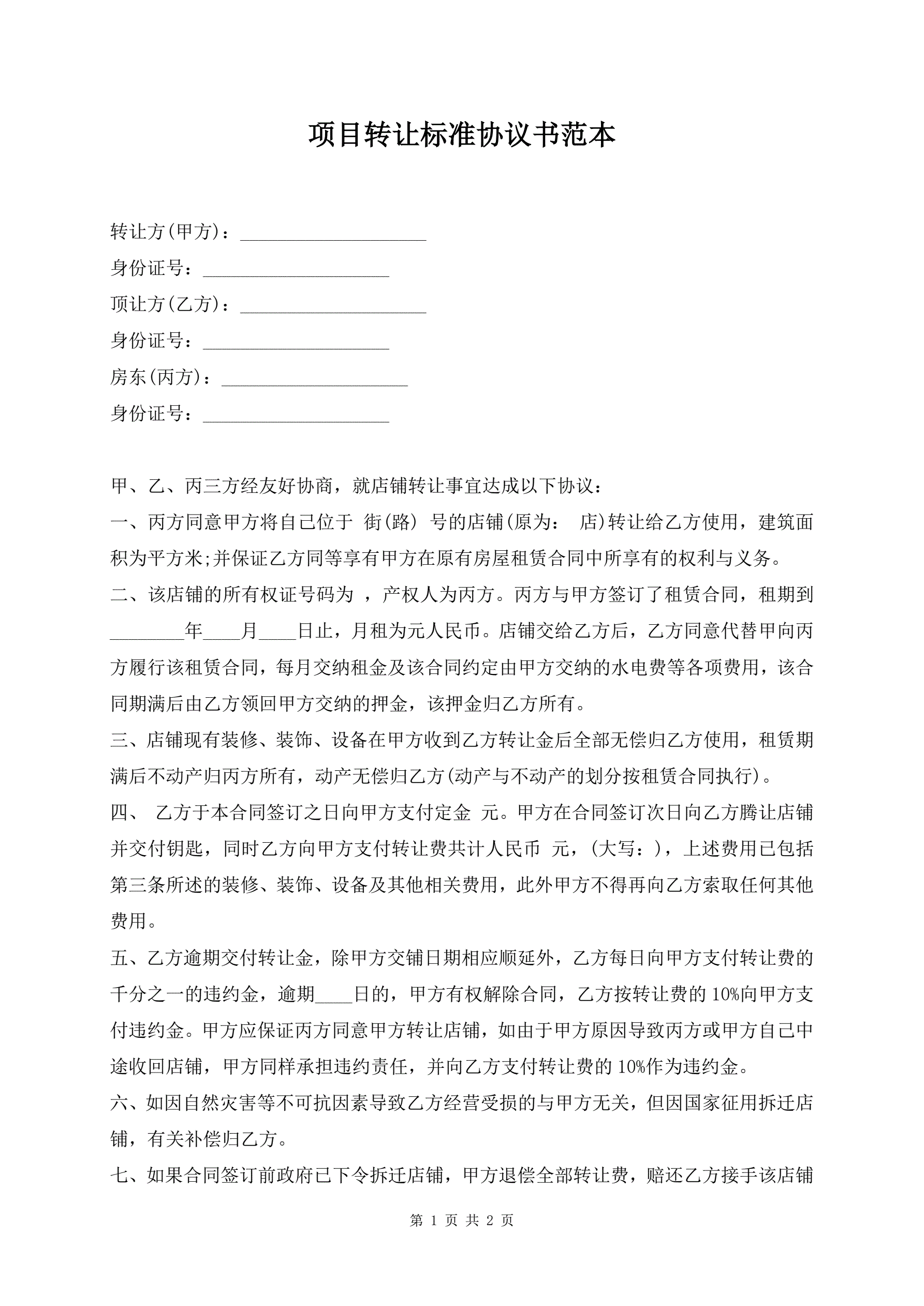 项目转让标准协议书范本