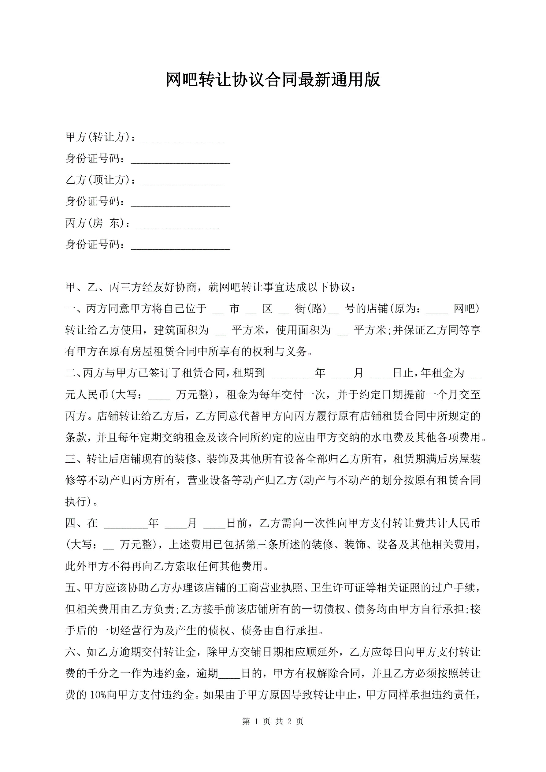 网吧转让协议合同最新通用版