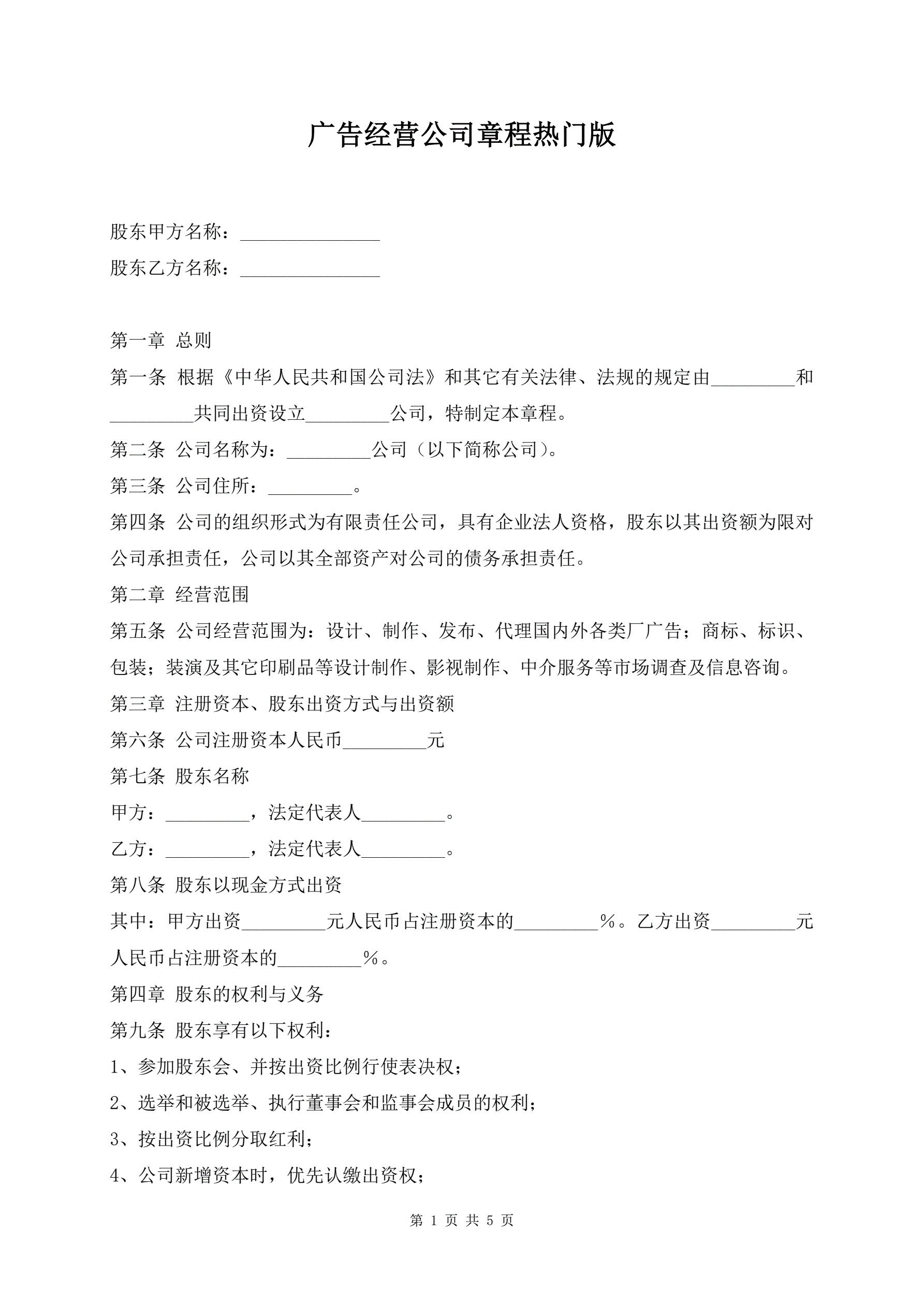 >广告经营公司章程热门版