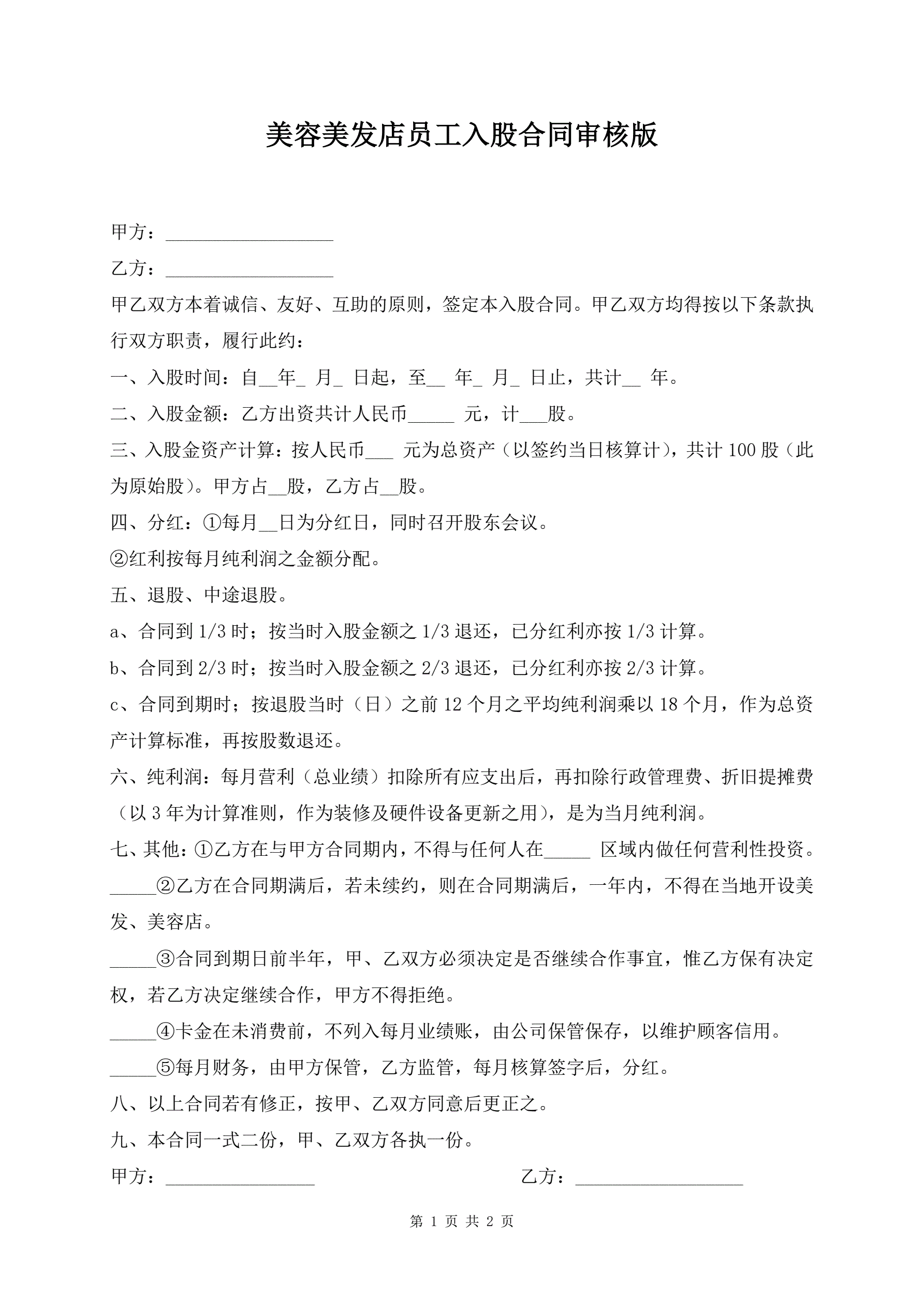 >美容美发店员工入股合同审核版