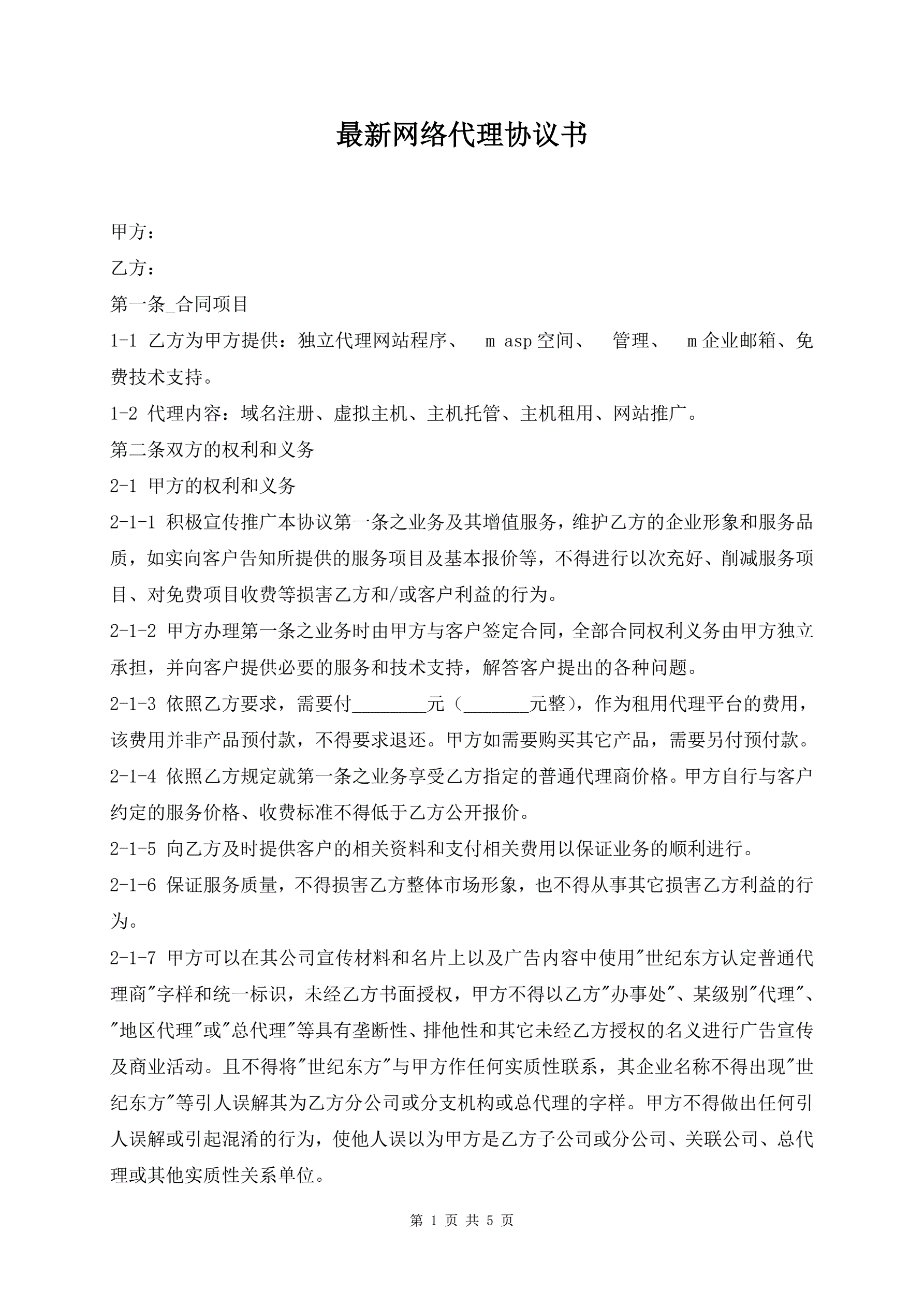 最新网络代理协议书