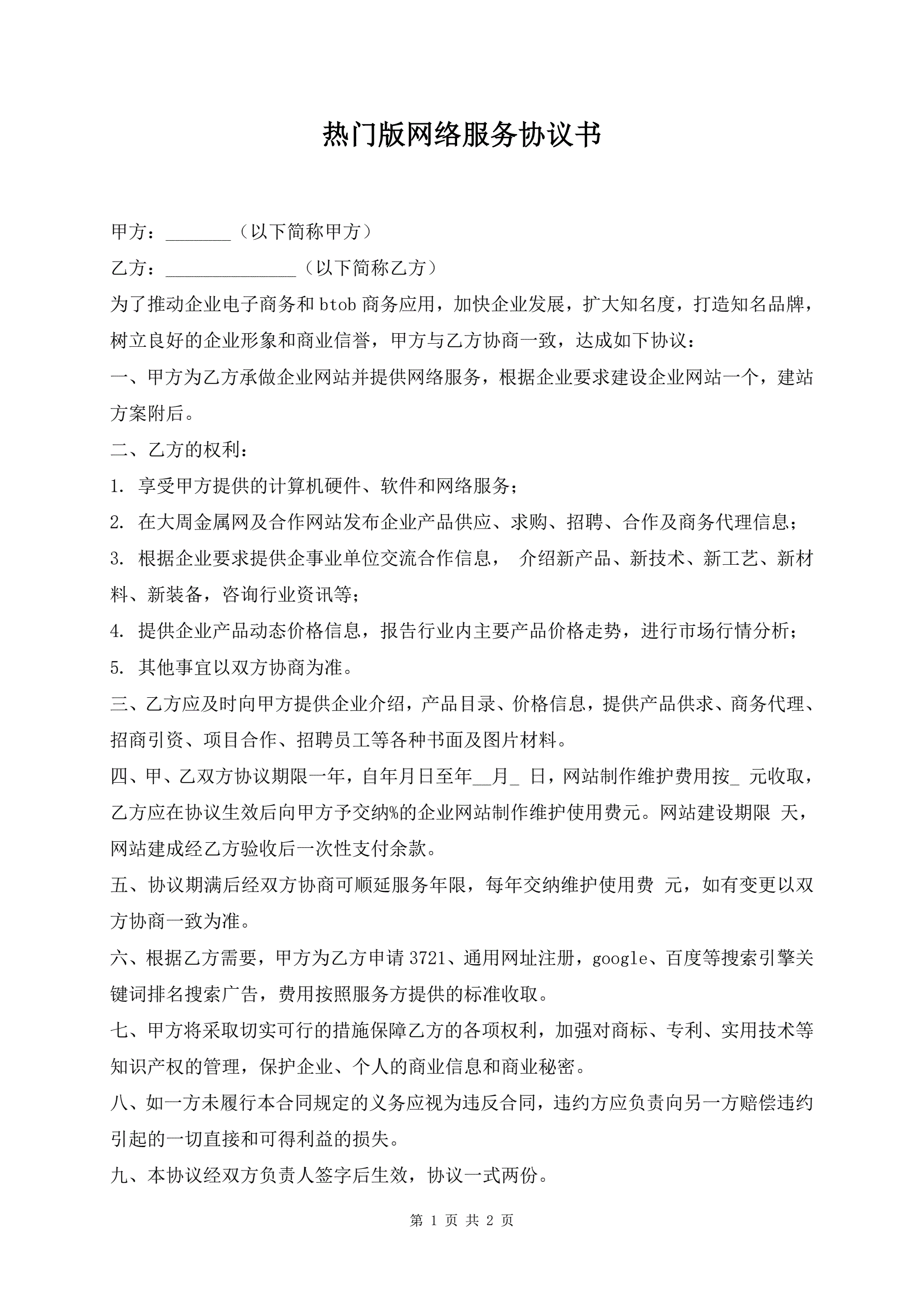 >热门版网络服务协议书