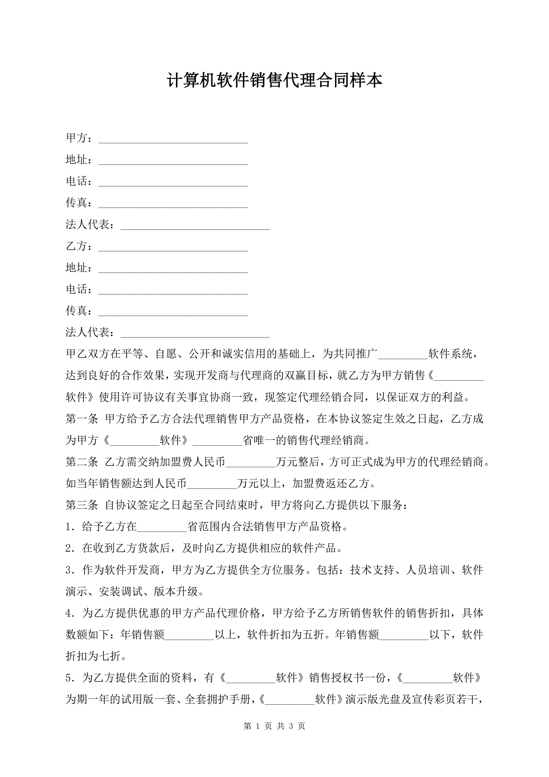 计算机软件销售代理合同样本