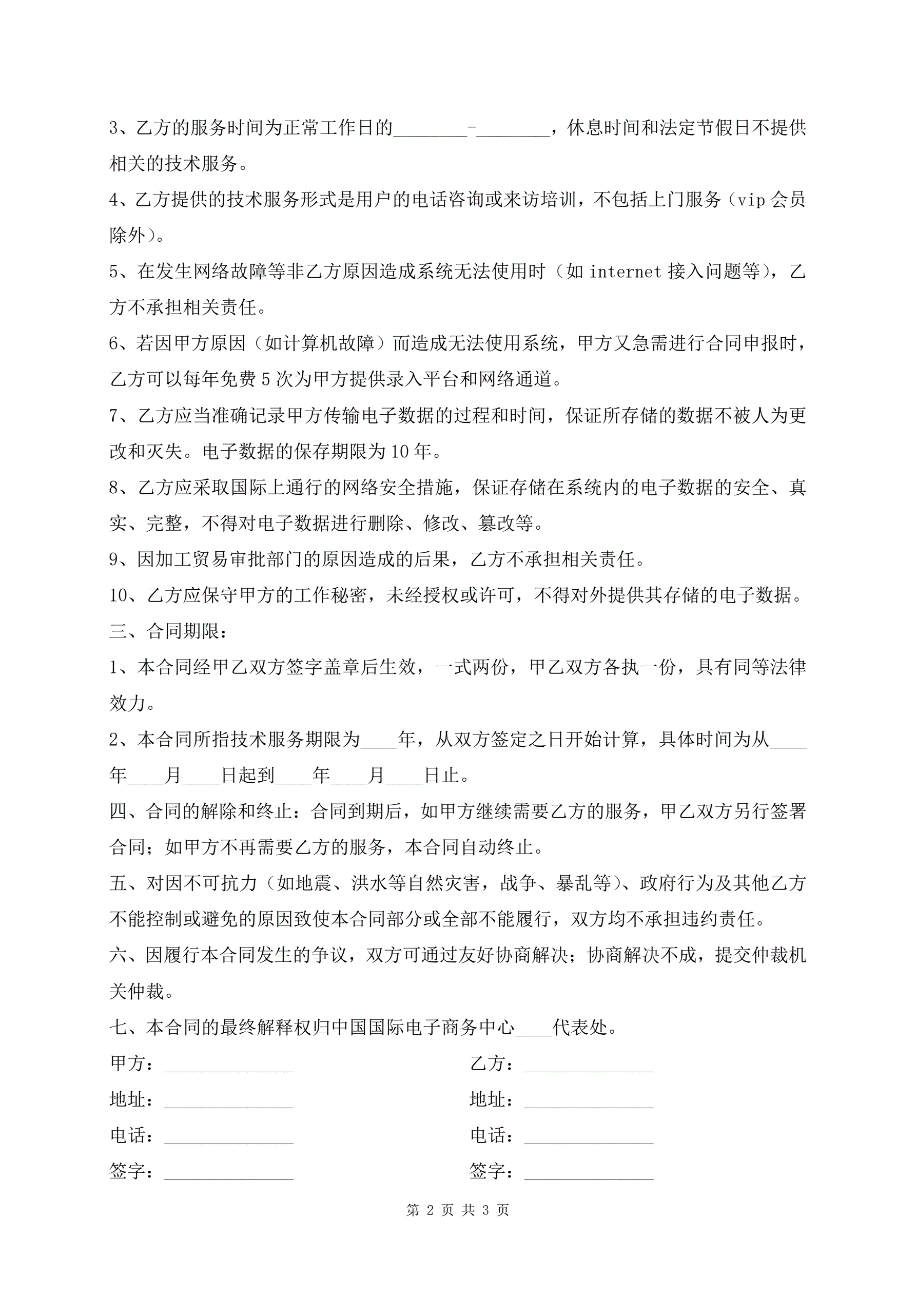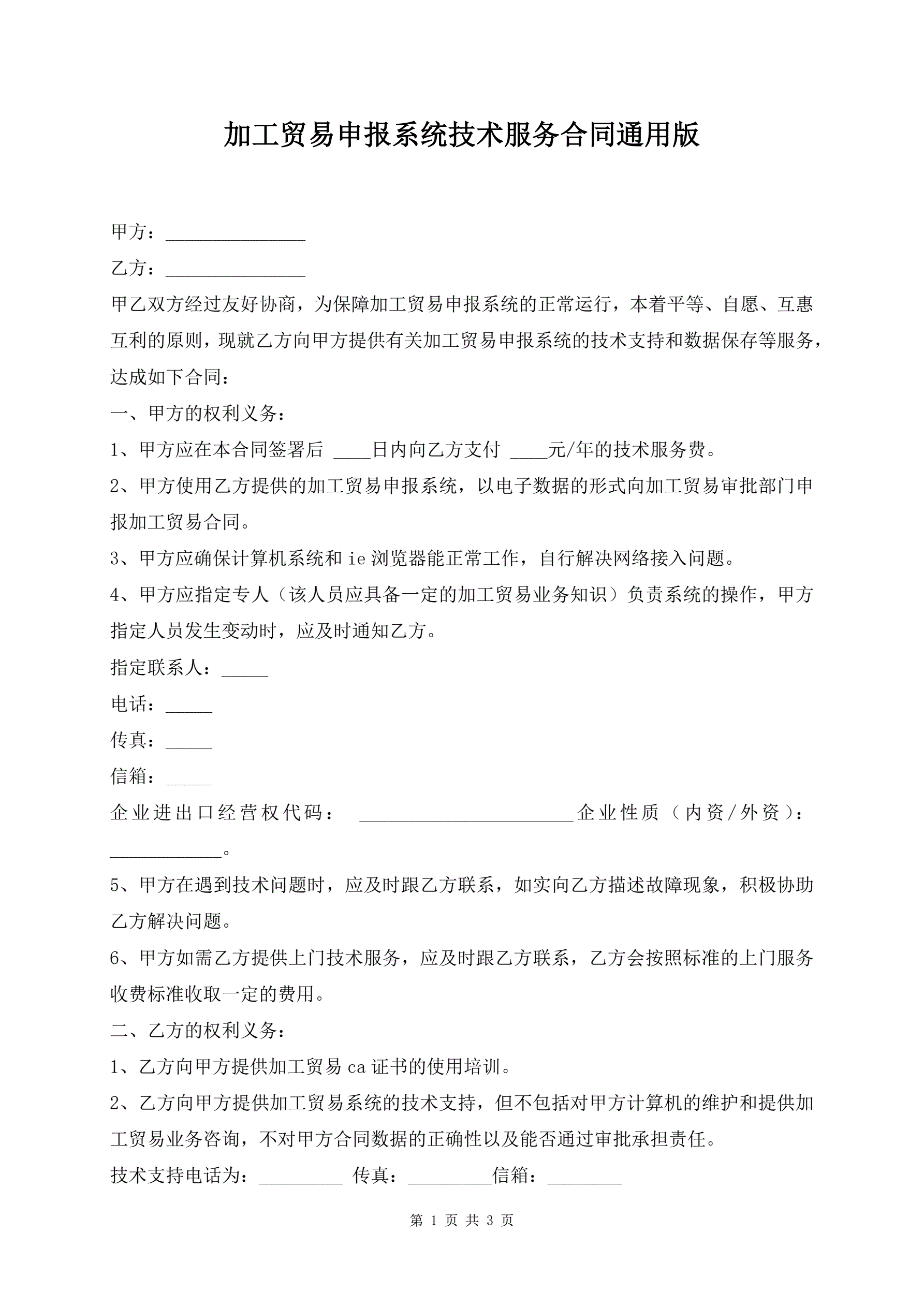 >加工贸易申报系统技术服务合同通用版