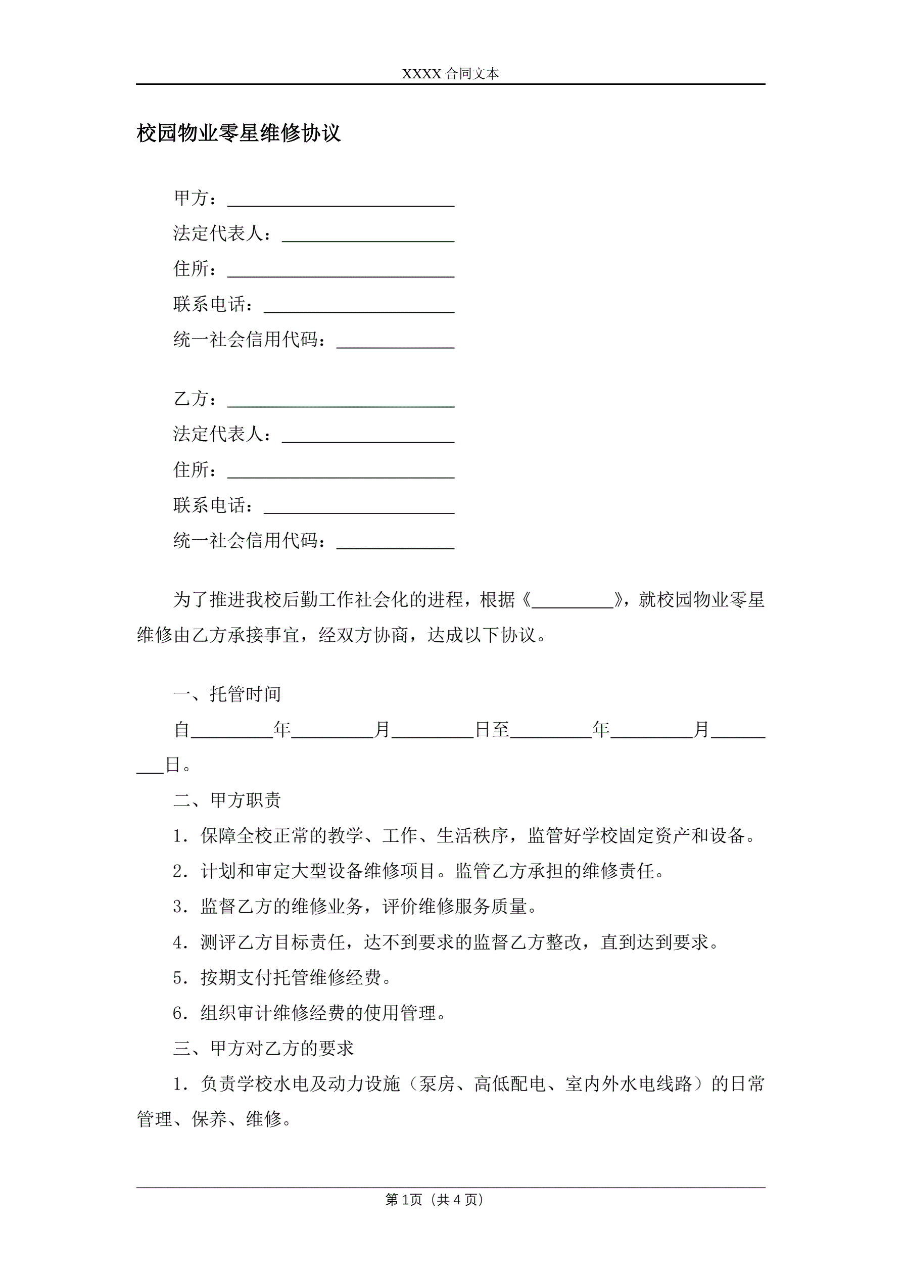 校园物业零星维修协议