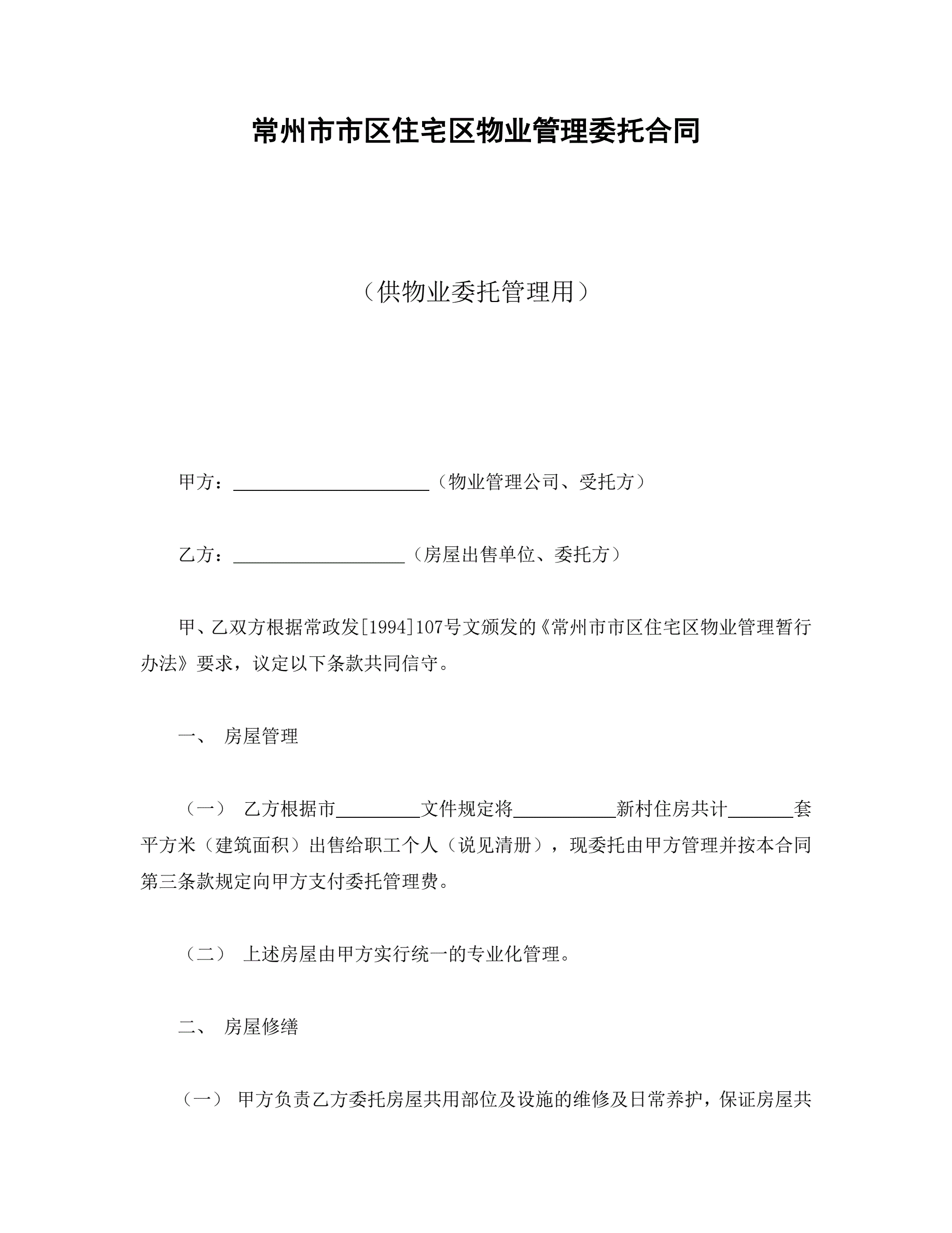 >常州市市区住宅区物业管理委托合同(供物业委托管理用)