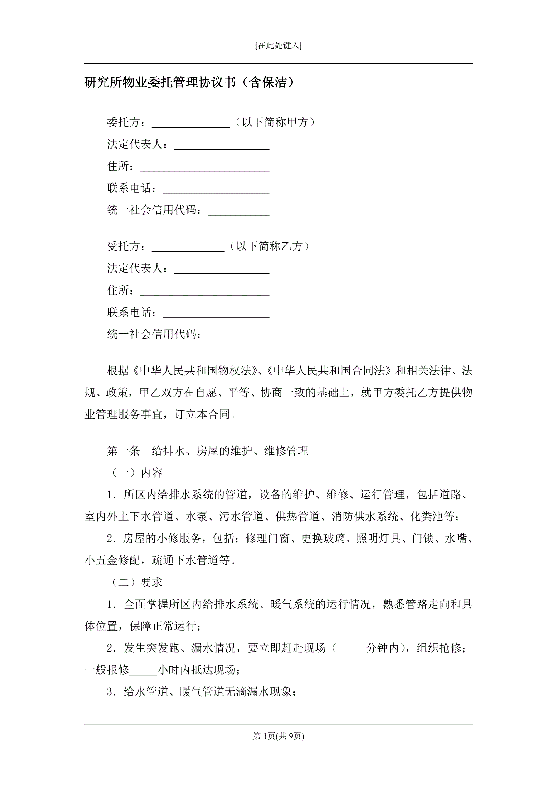 研究所物业委托管理协议书(含保洁)