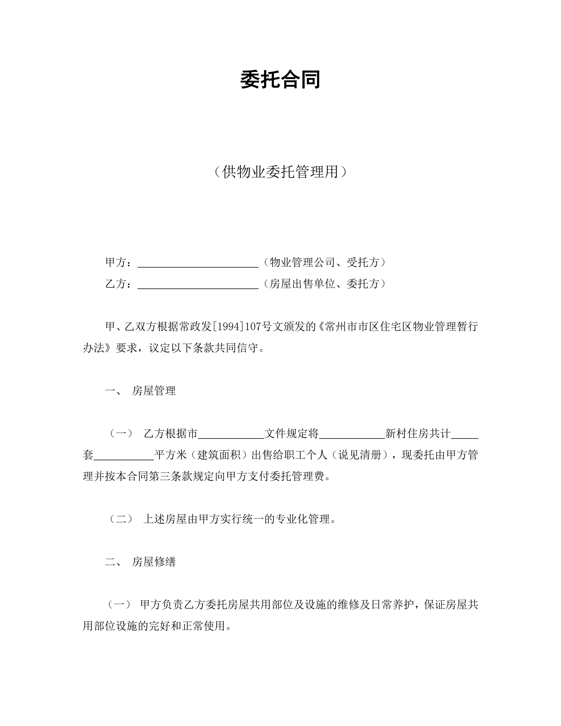 >委托合同(供物业委托管理用)