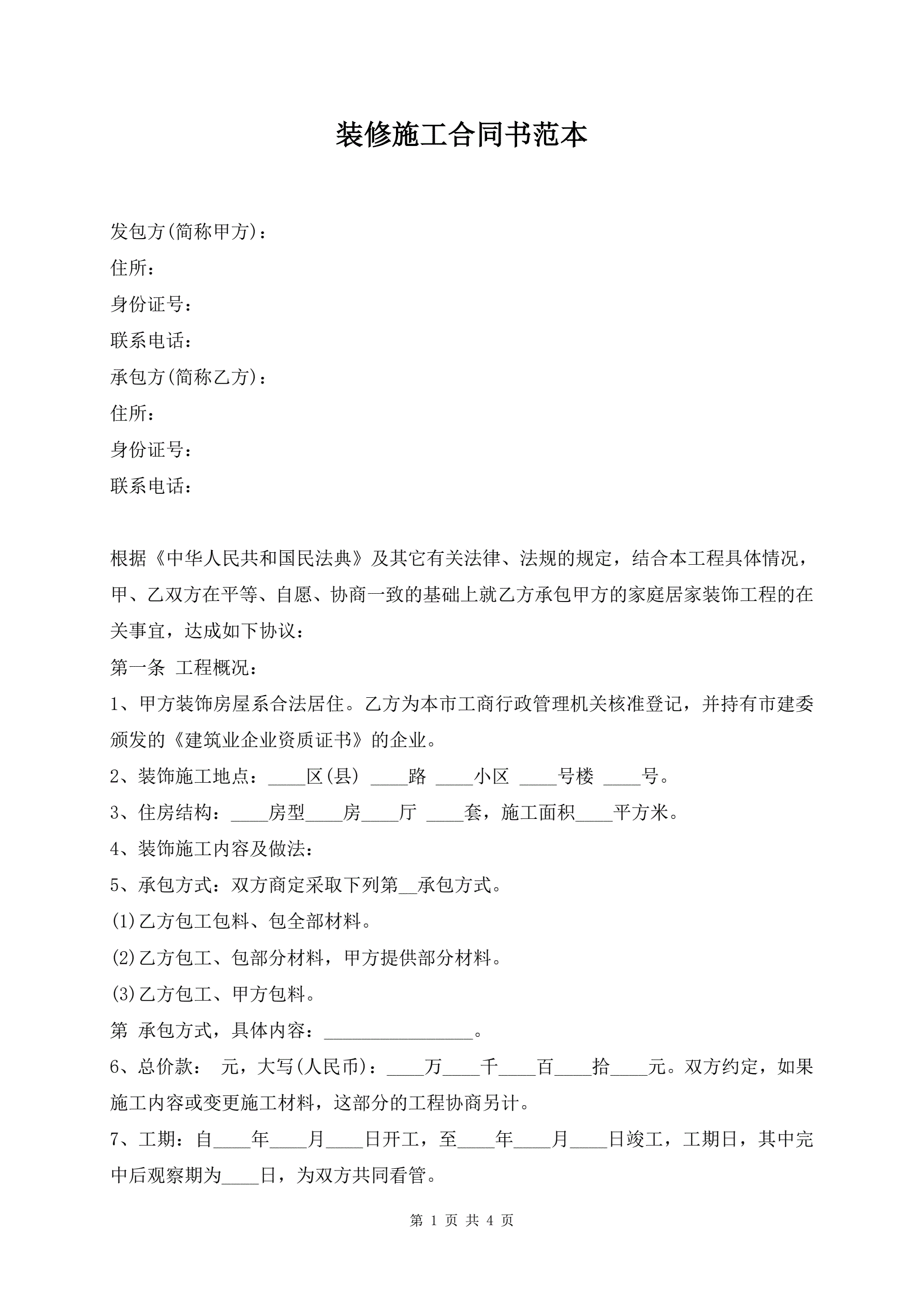 >装修施工合同书范本