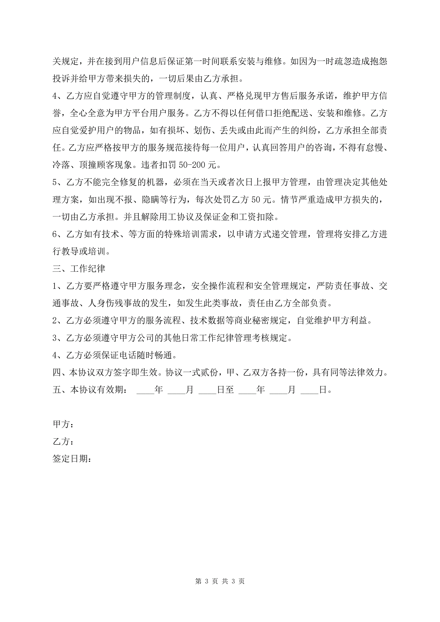 家电安装工作协议合同范本
