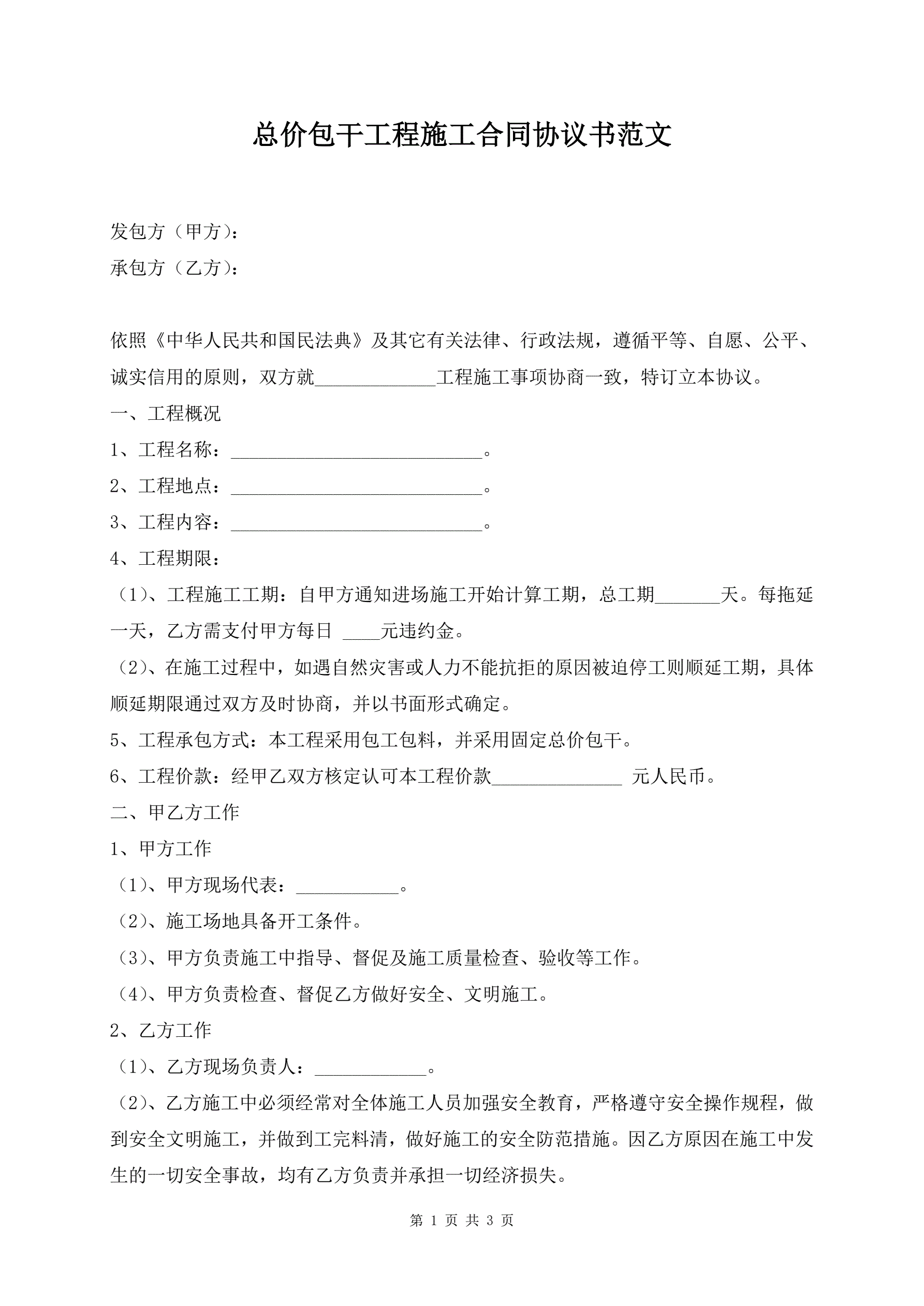 总价包干工程施工合同协议书范文