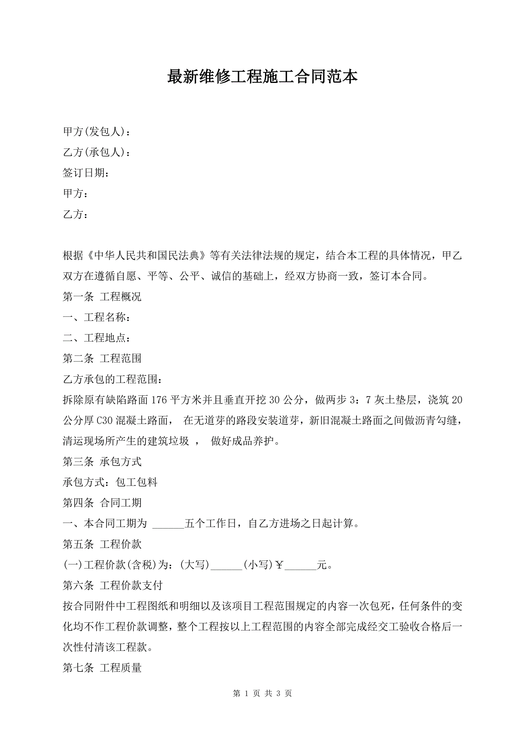 >最新维修工程施工合同范本