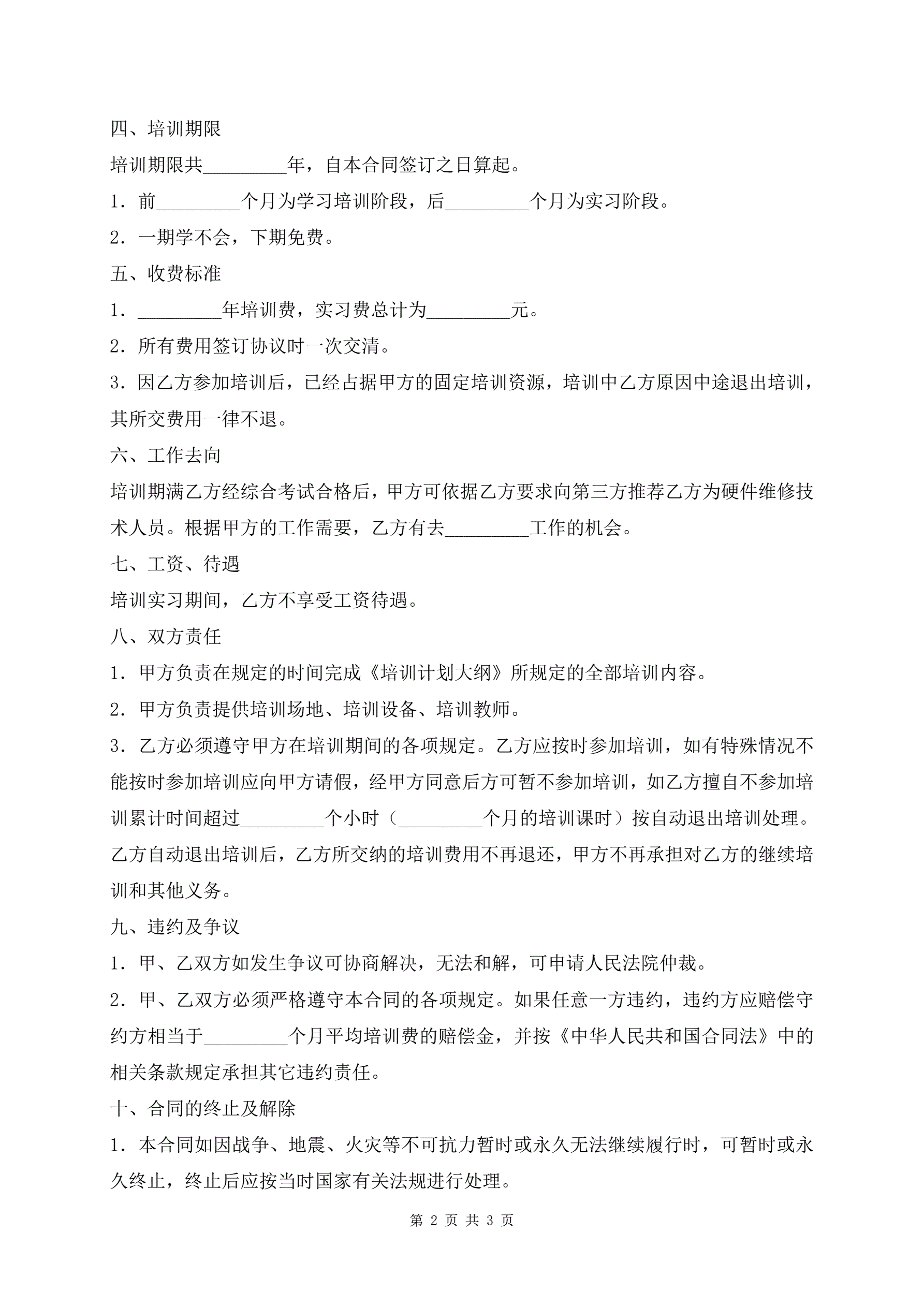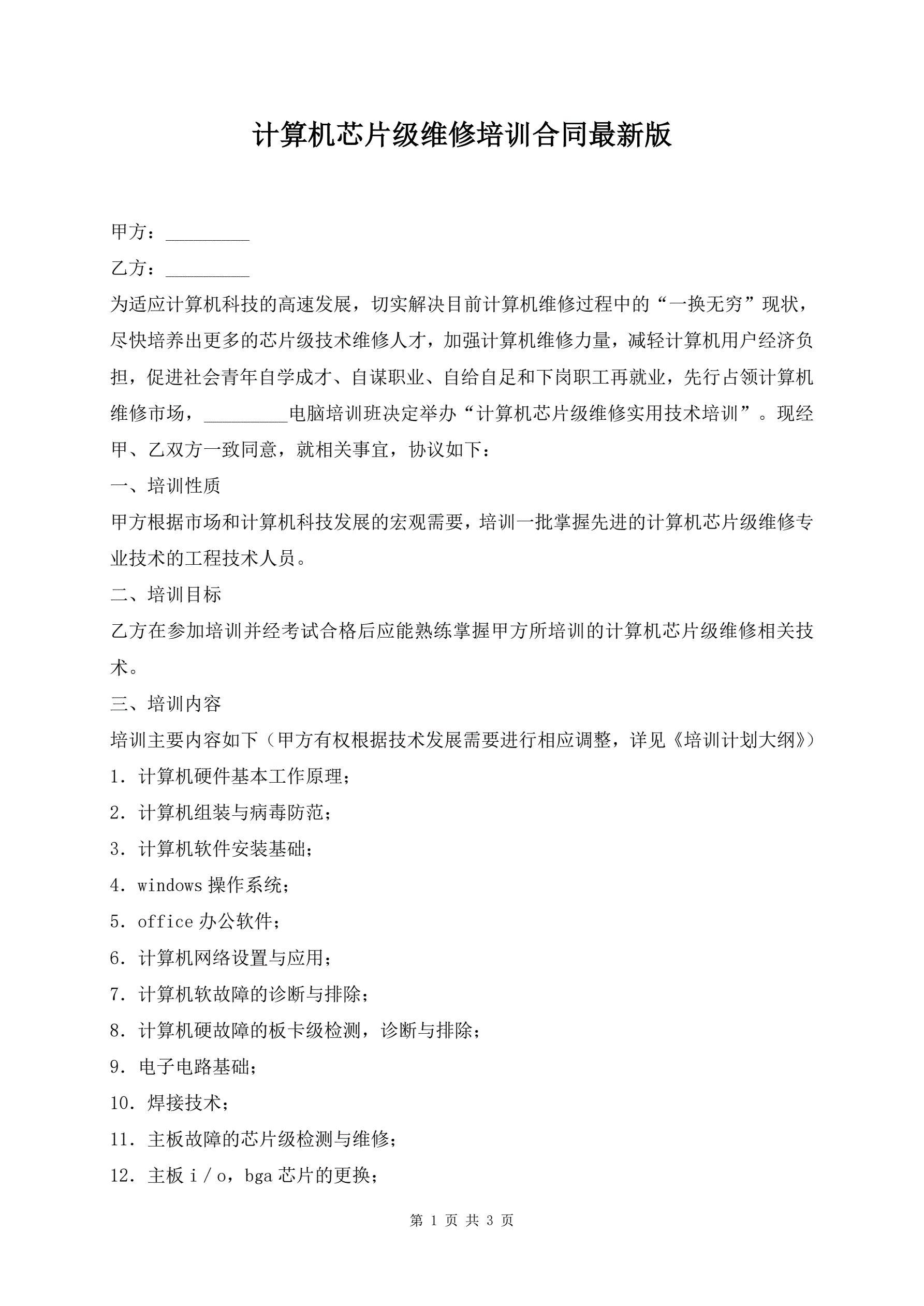 >计算机芯片级维修培训合同最新版