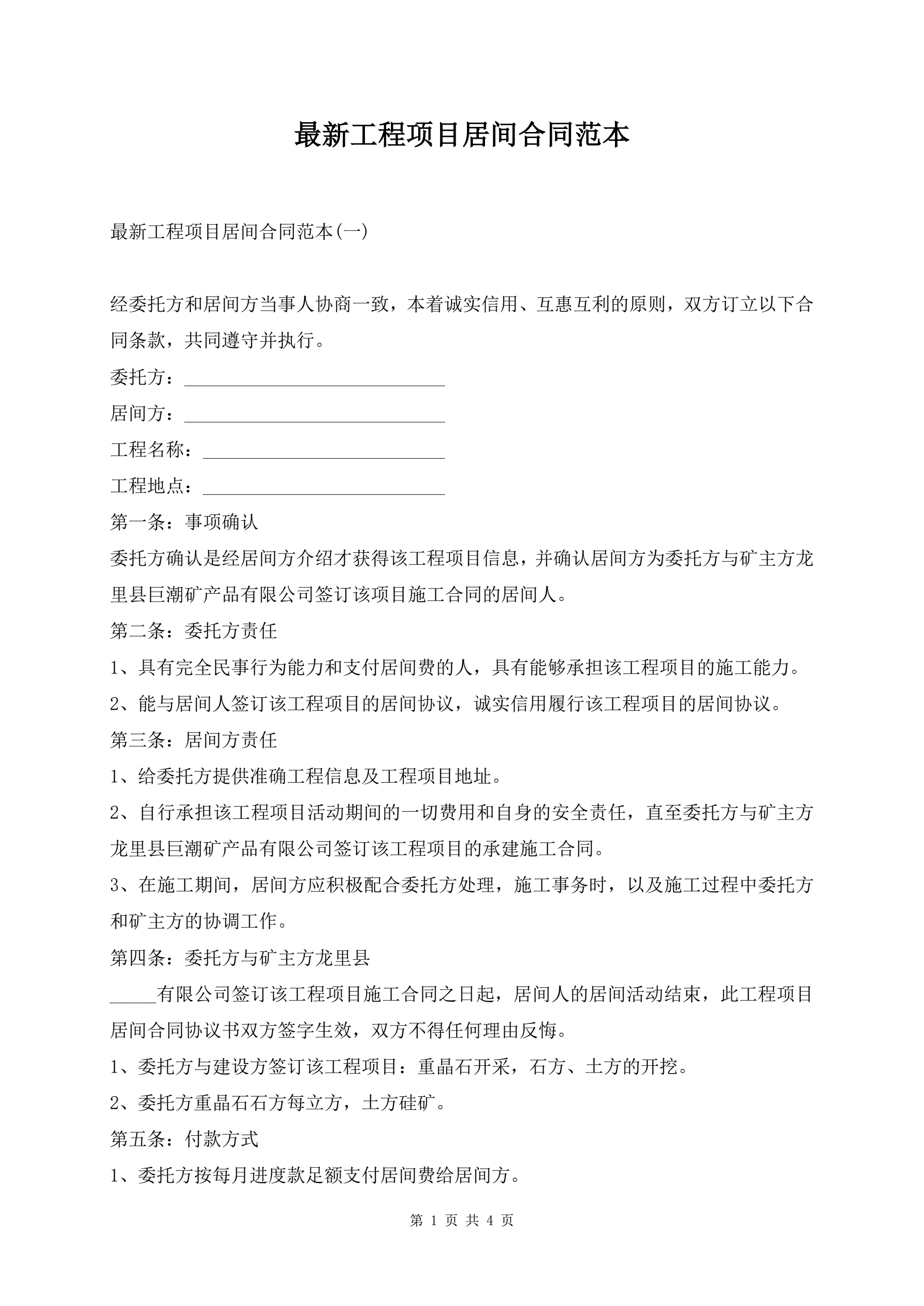 >最新工程项目居间合同范本
