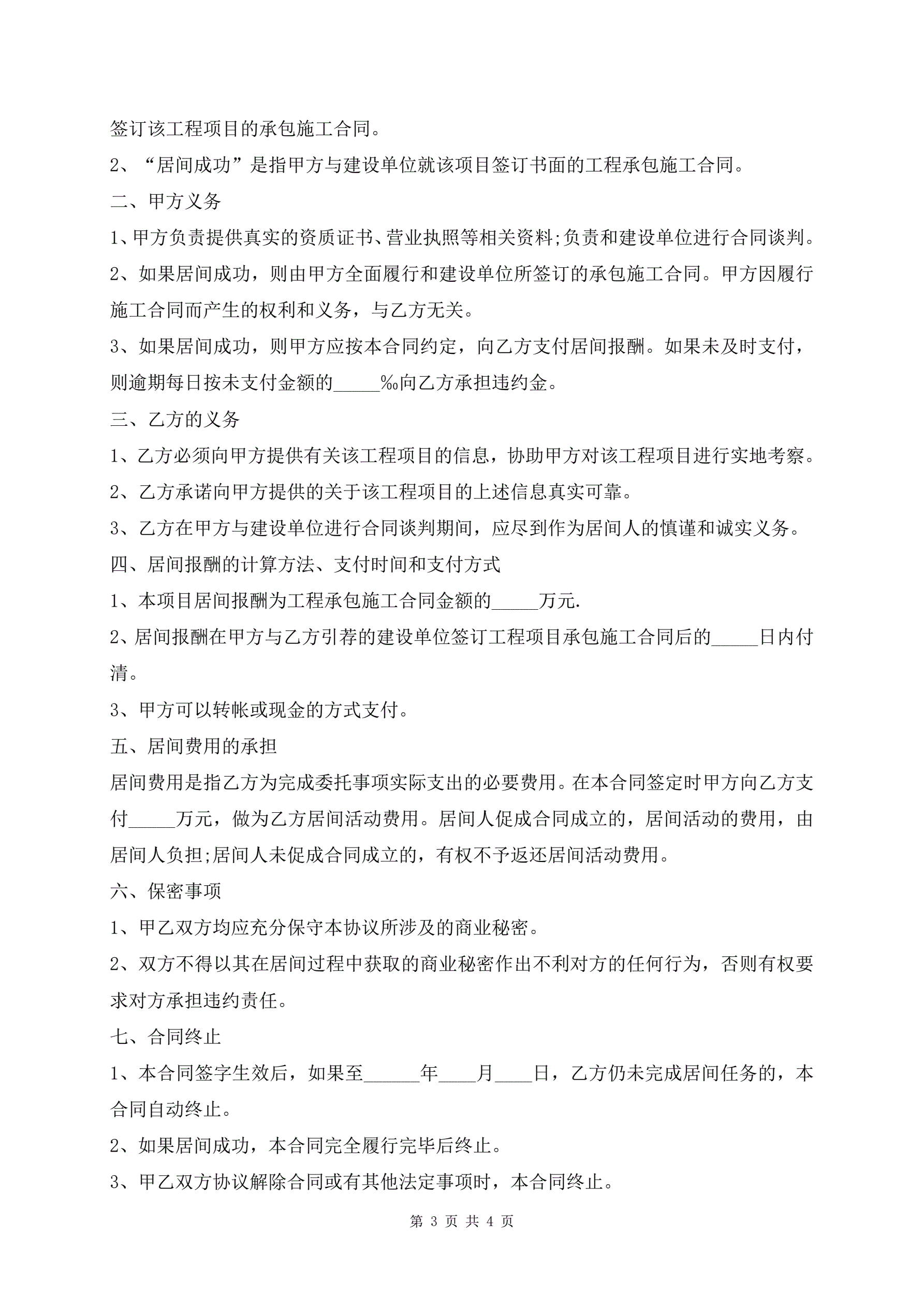 最新工程项目居间合同范本