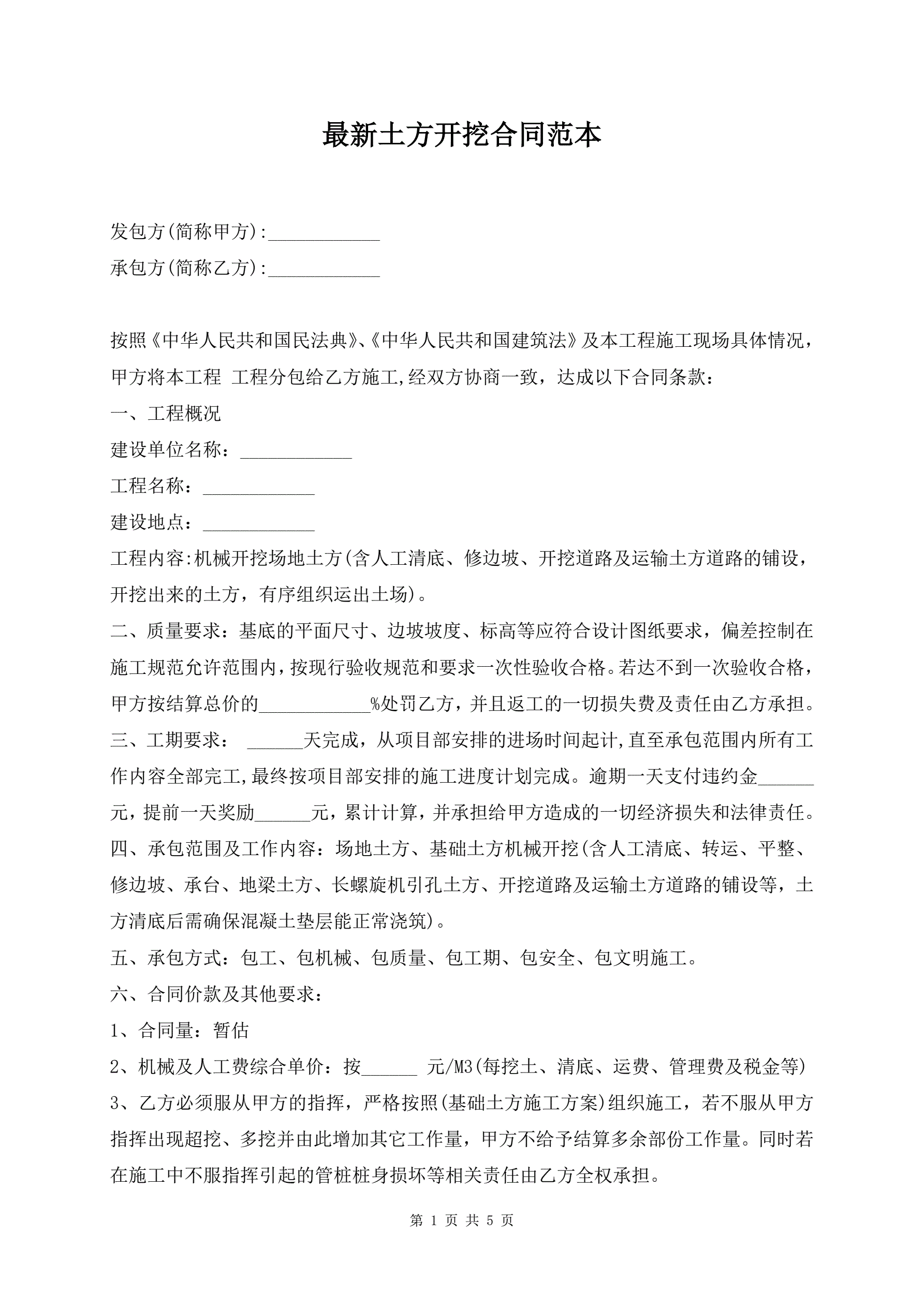 最新土方开挖合同范本