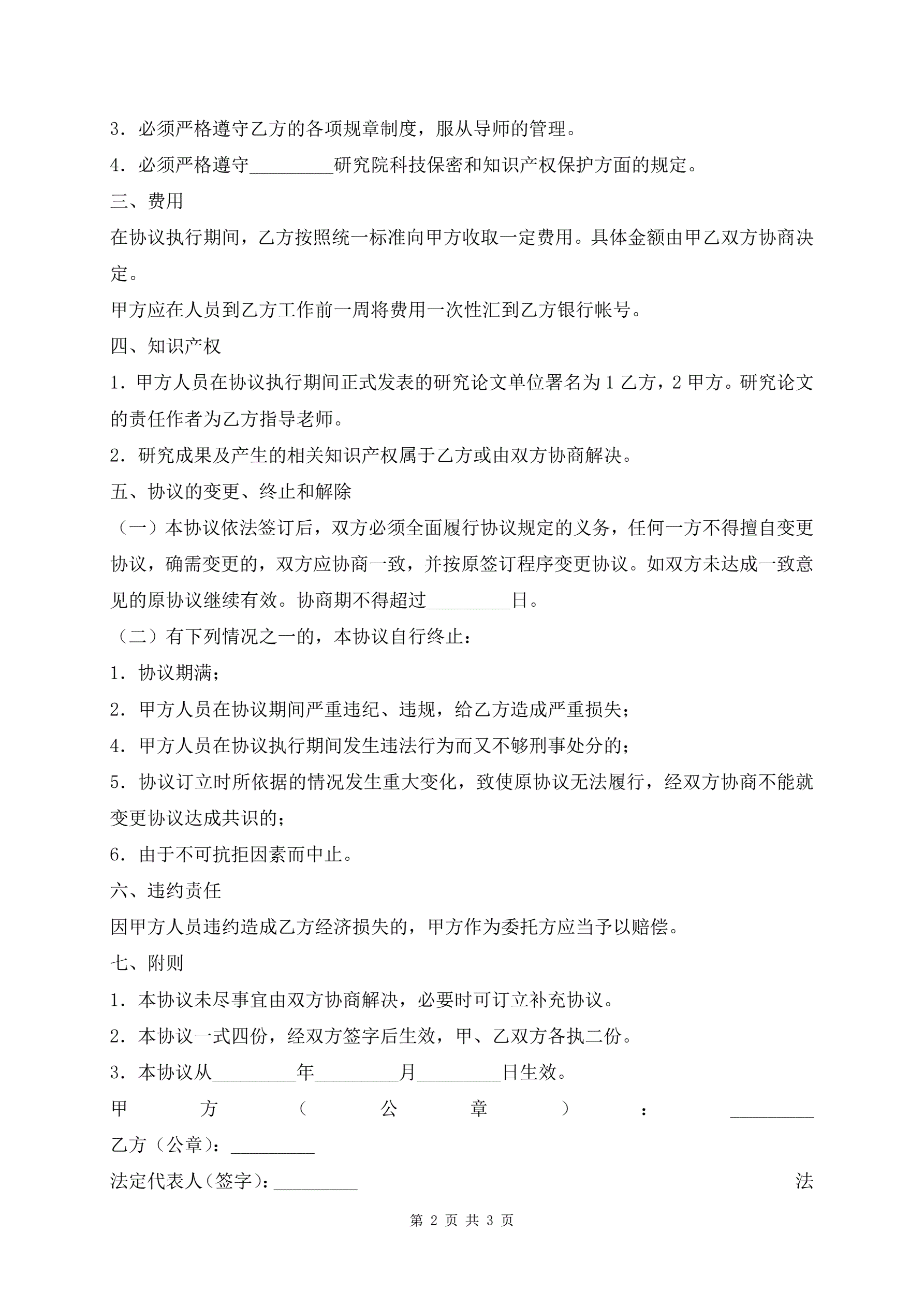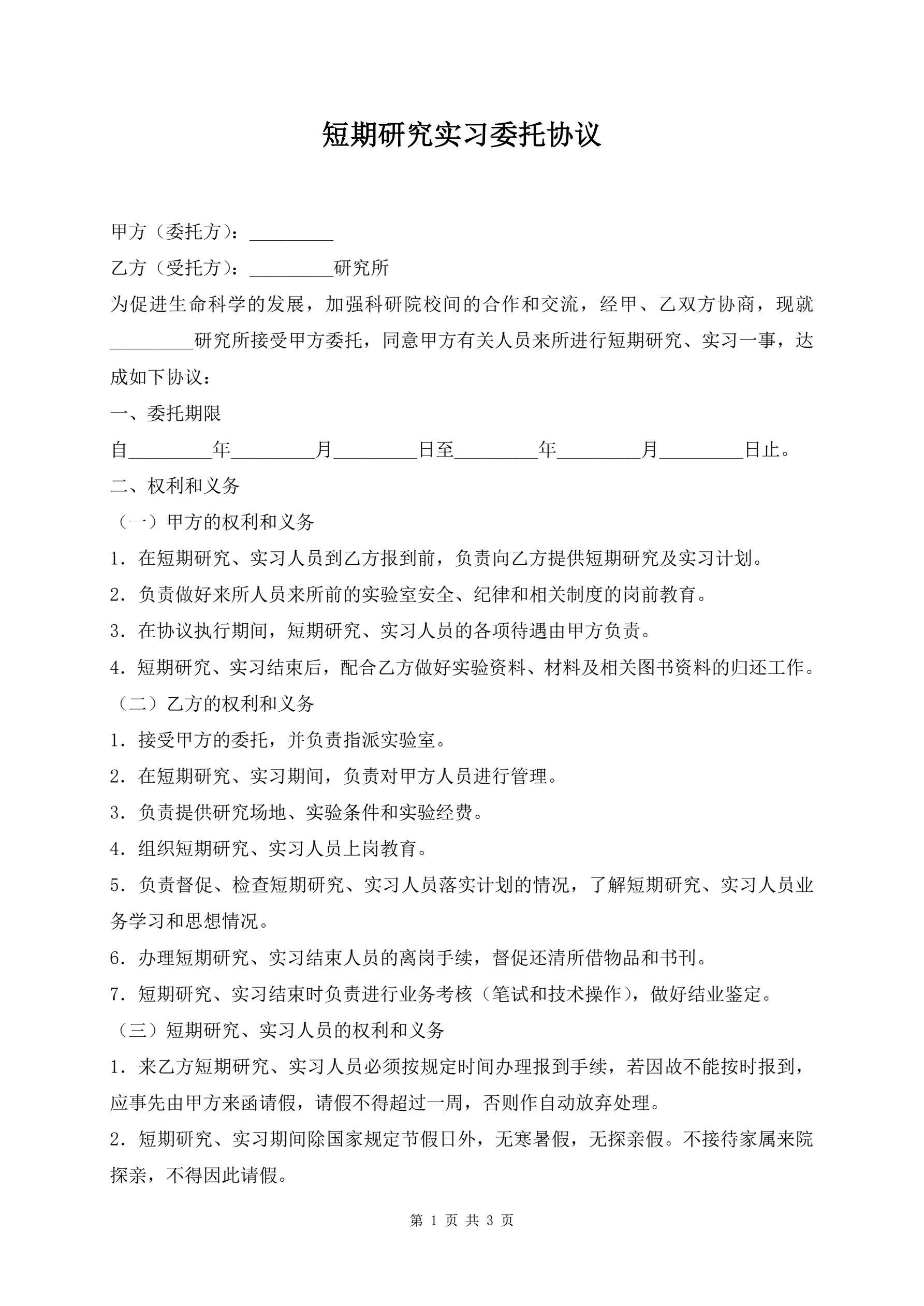 短期研究实习委托协议