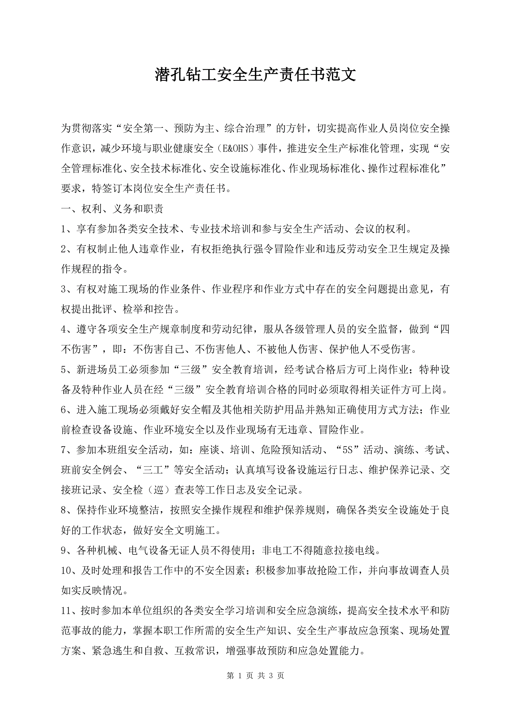 >潜孔钻工安全生产责任书范文