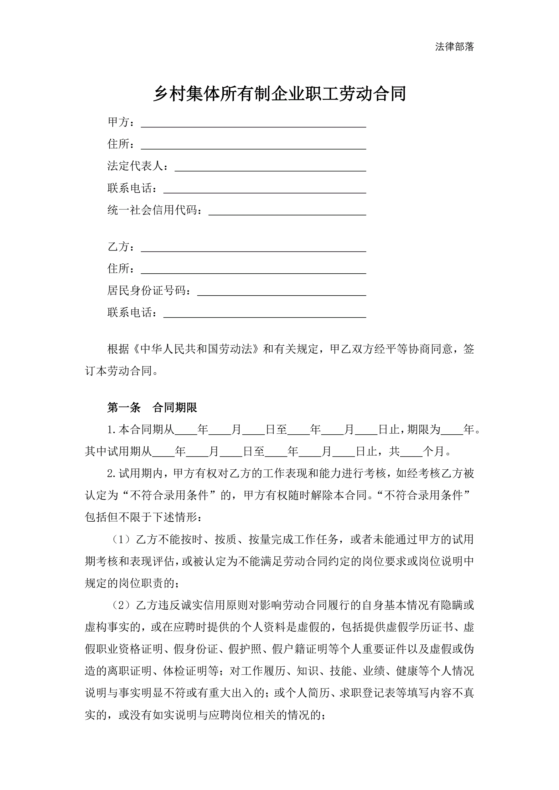 >乡村集体所有制企业职工劳动合同