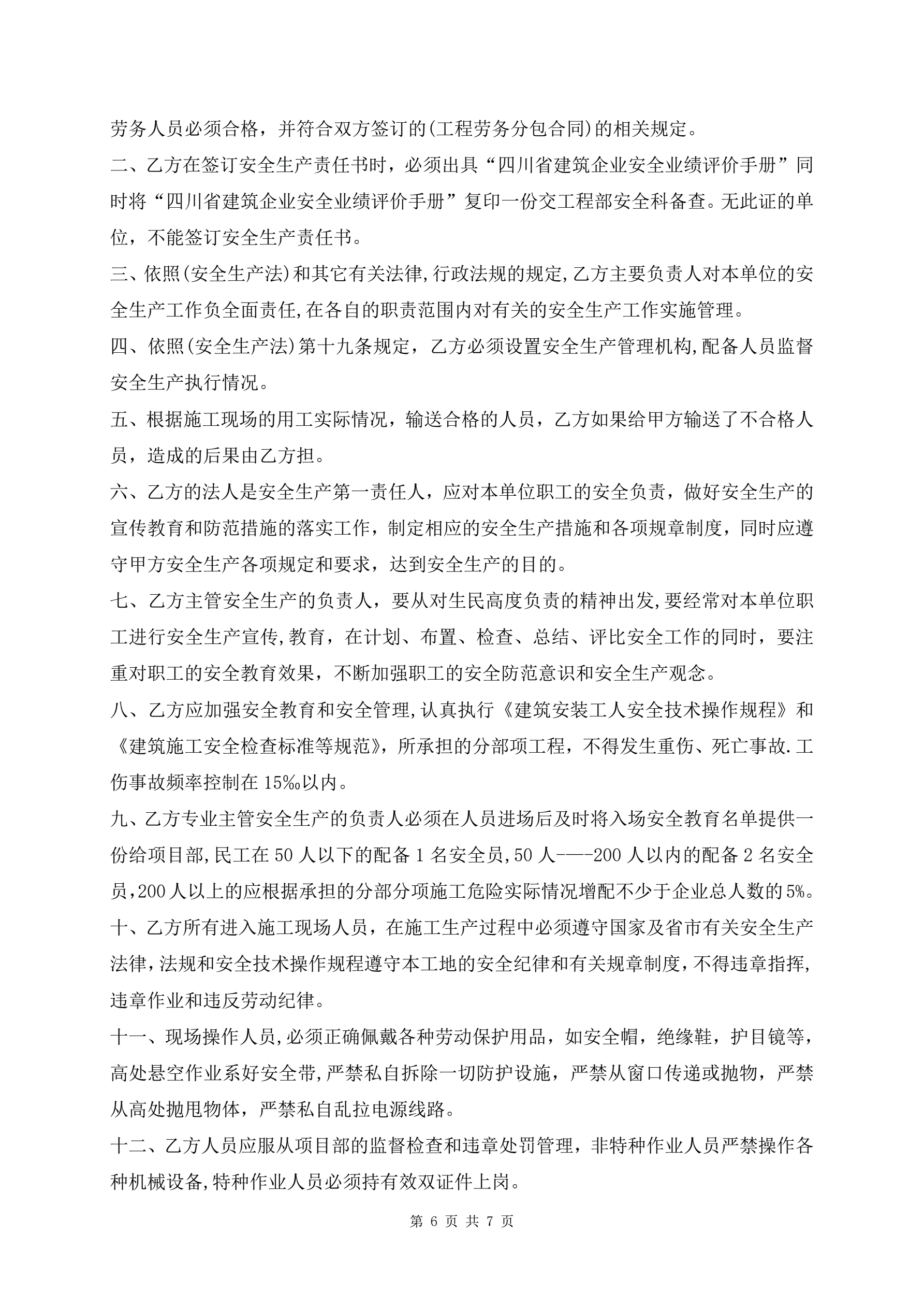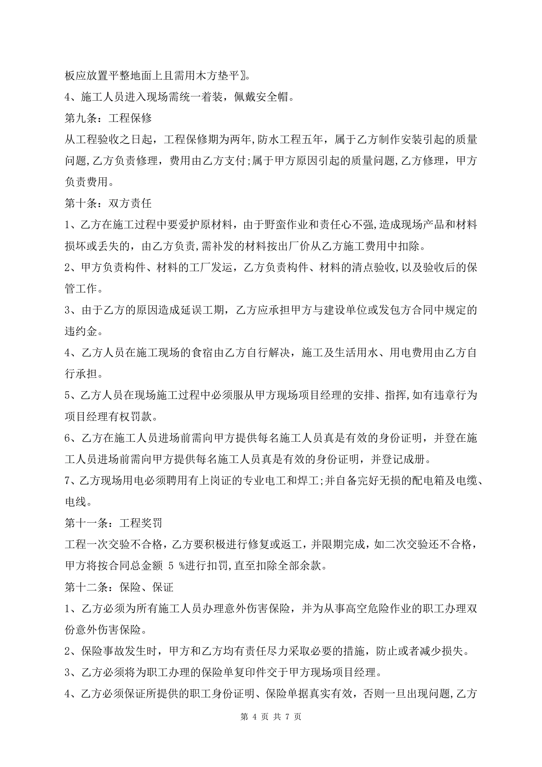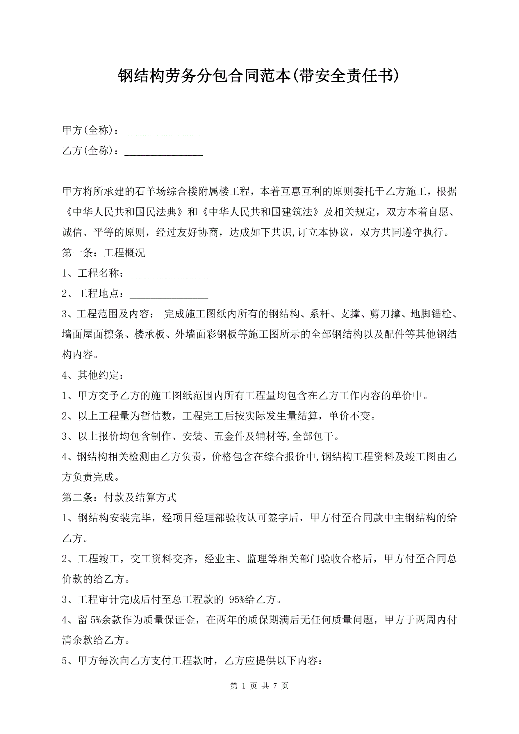 >钢结构劳务分包合同范本(带安全责任书)