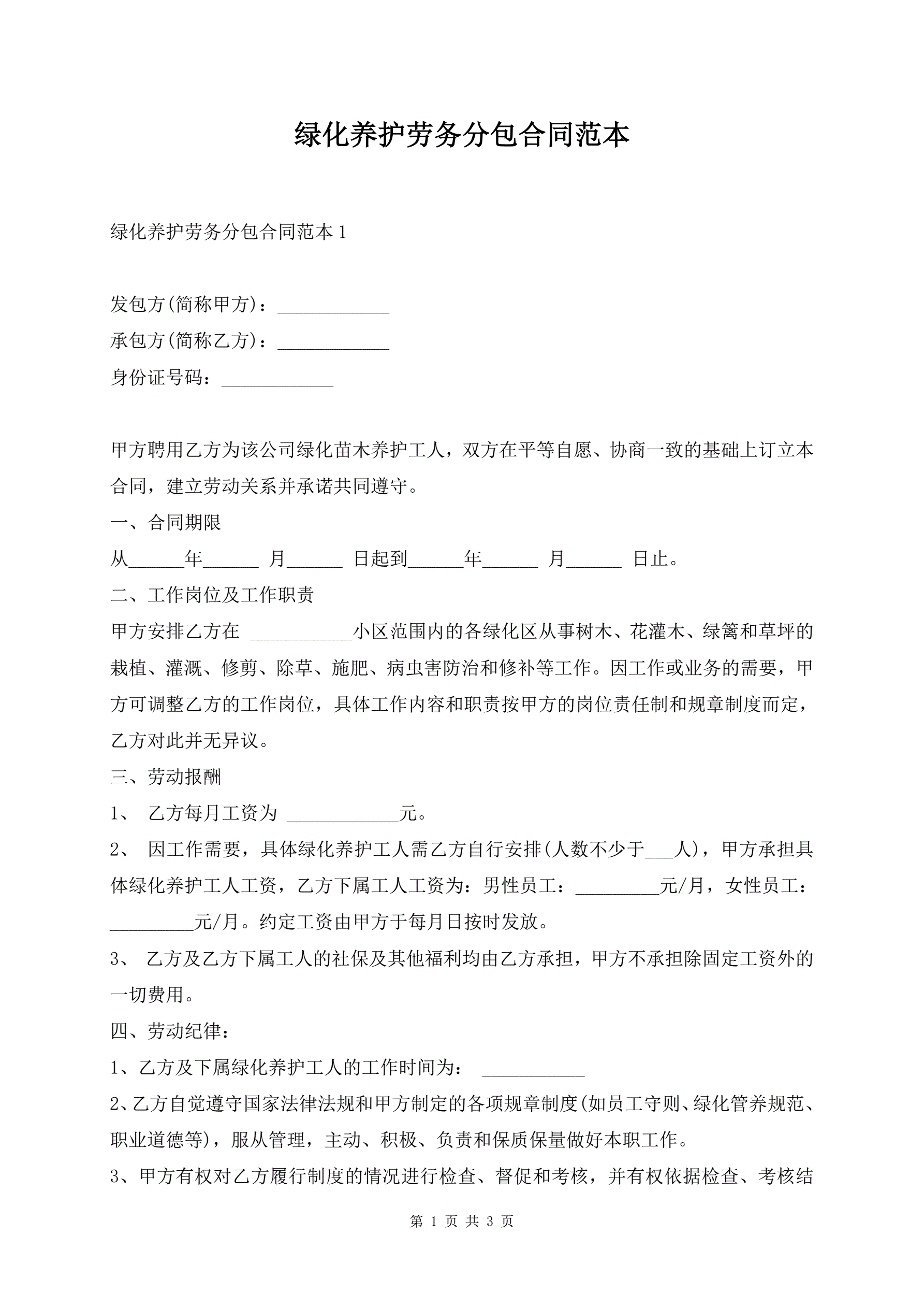 绿化养护劳务分包合同范本