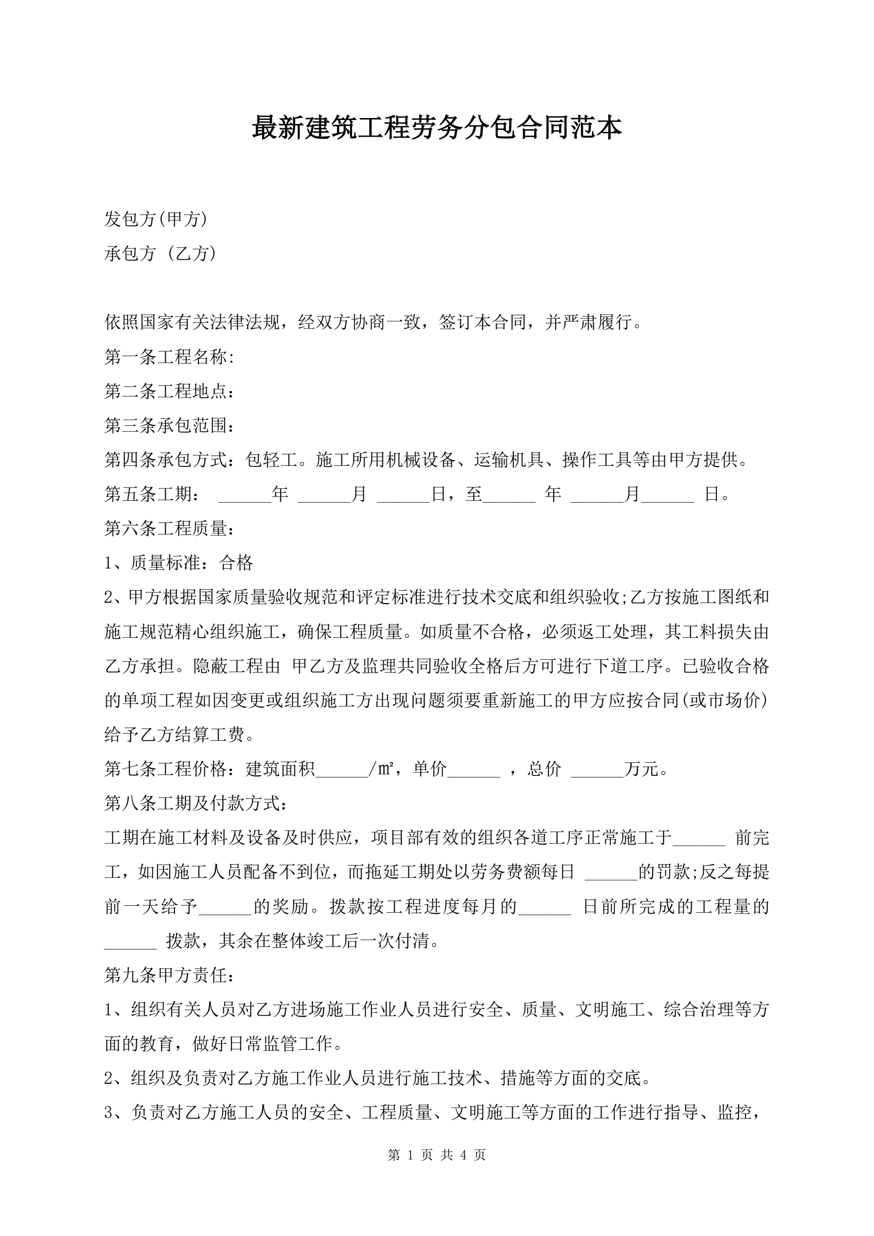 最新建筑工程劳务分包合同范本